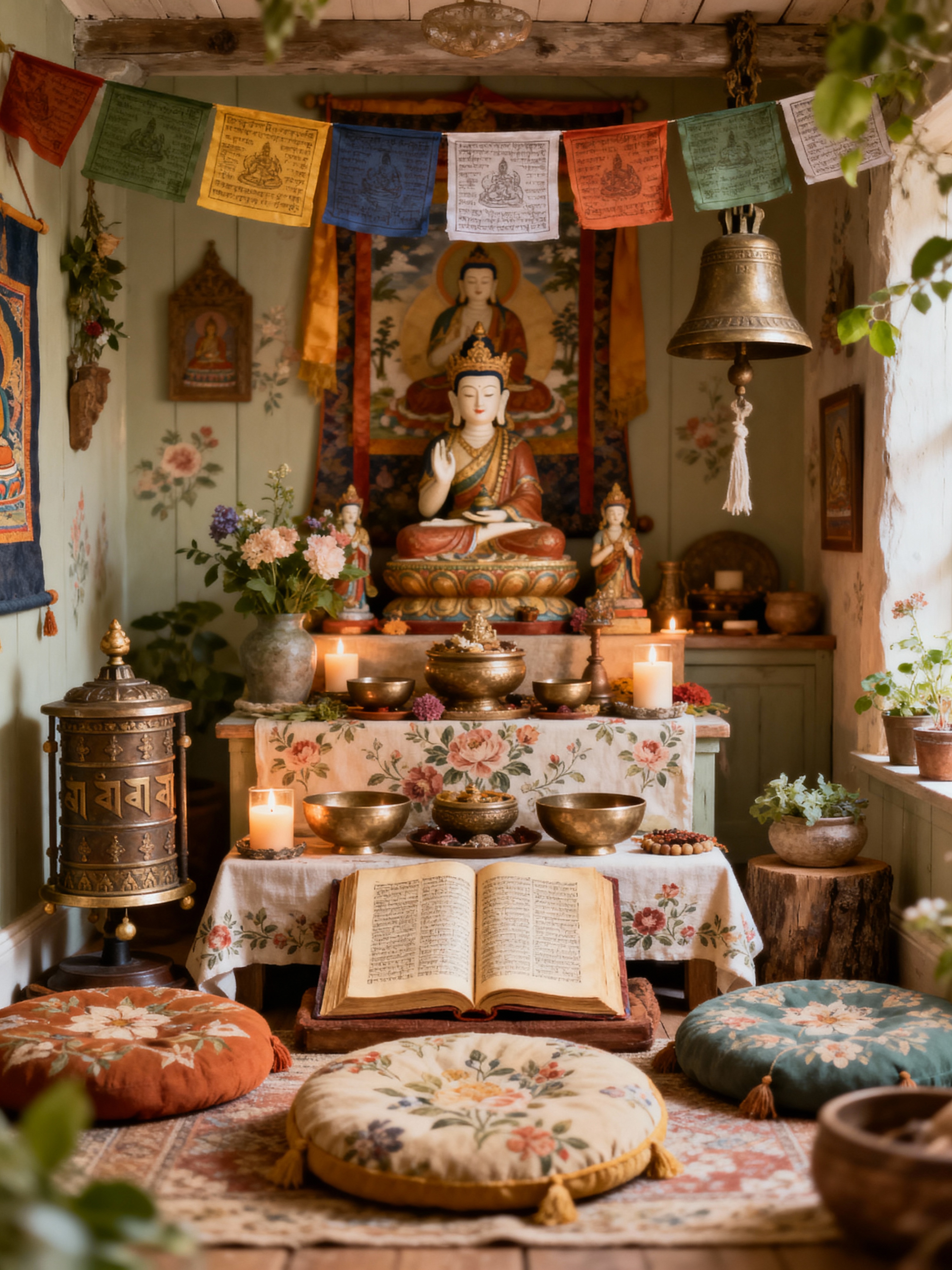 temple with cottagecore style with prayer flags and bells and religious statues and offerings bowl and meditation cushions and sacred texts and prayer wheels and candles. . with cottage style and floral patterns and muted colors and organic and rustic and natural and earthy and country style