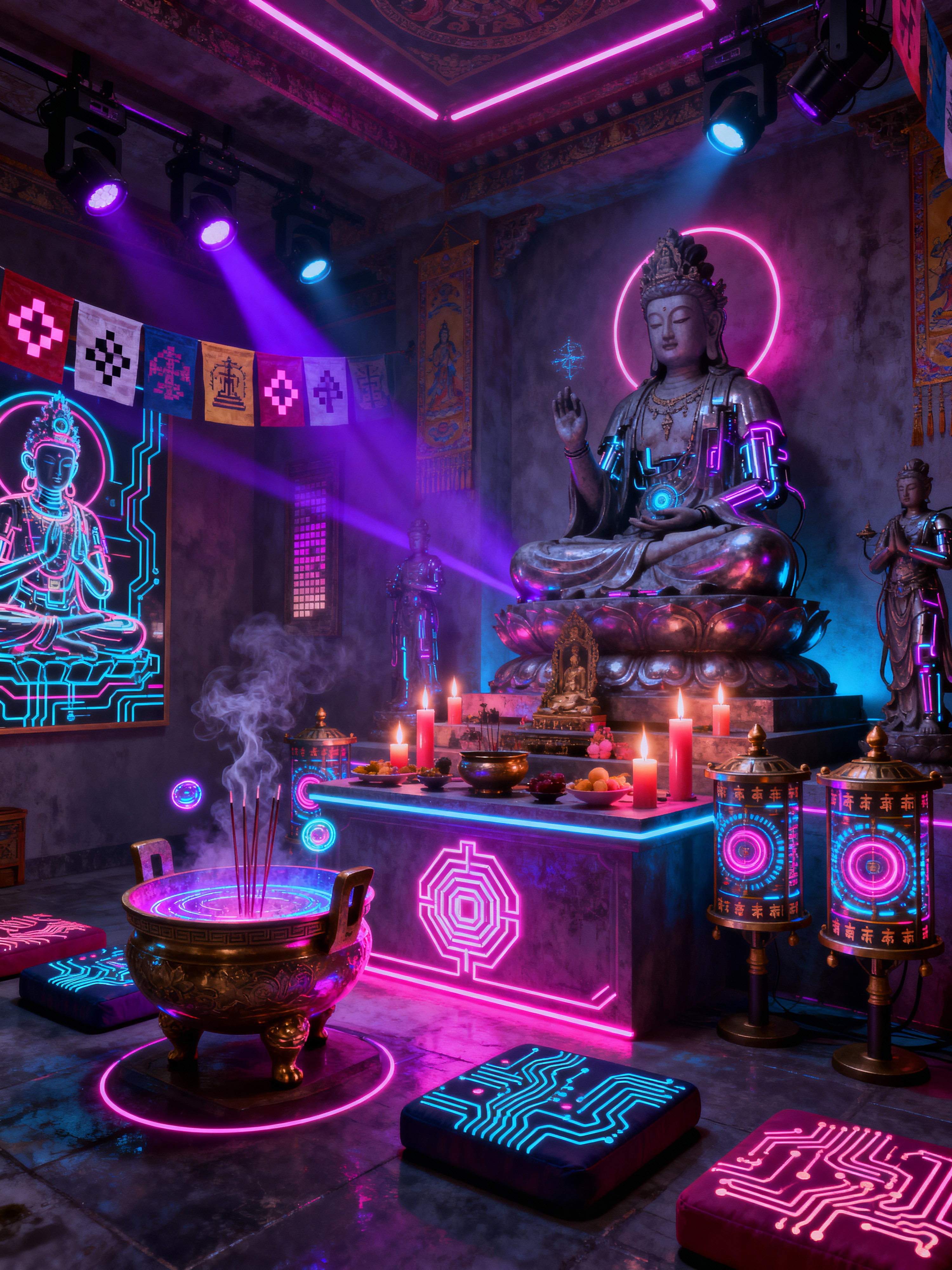 temple with cyberpunk style with incense burner and altar and offerings bowl and prayer flags and candles and religious statues and prayer wheels and meditation cushions. . with led lights and cyberpunk style and surrealist paintings and black lights and synthwave and bladerunner lights and futuristic cybernetic details and bladerunner style