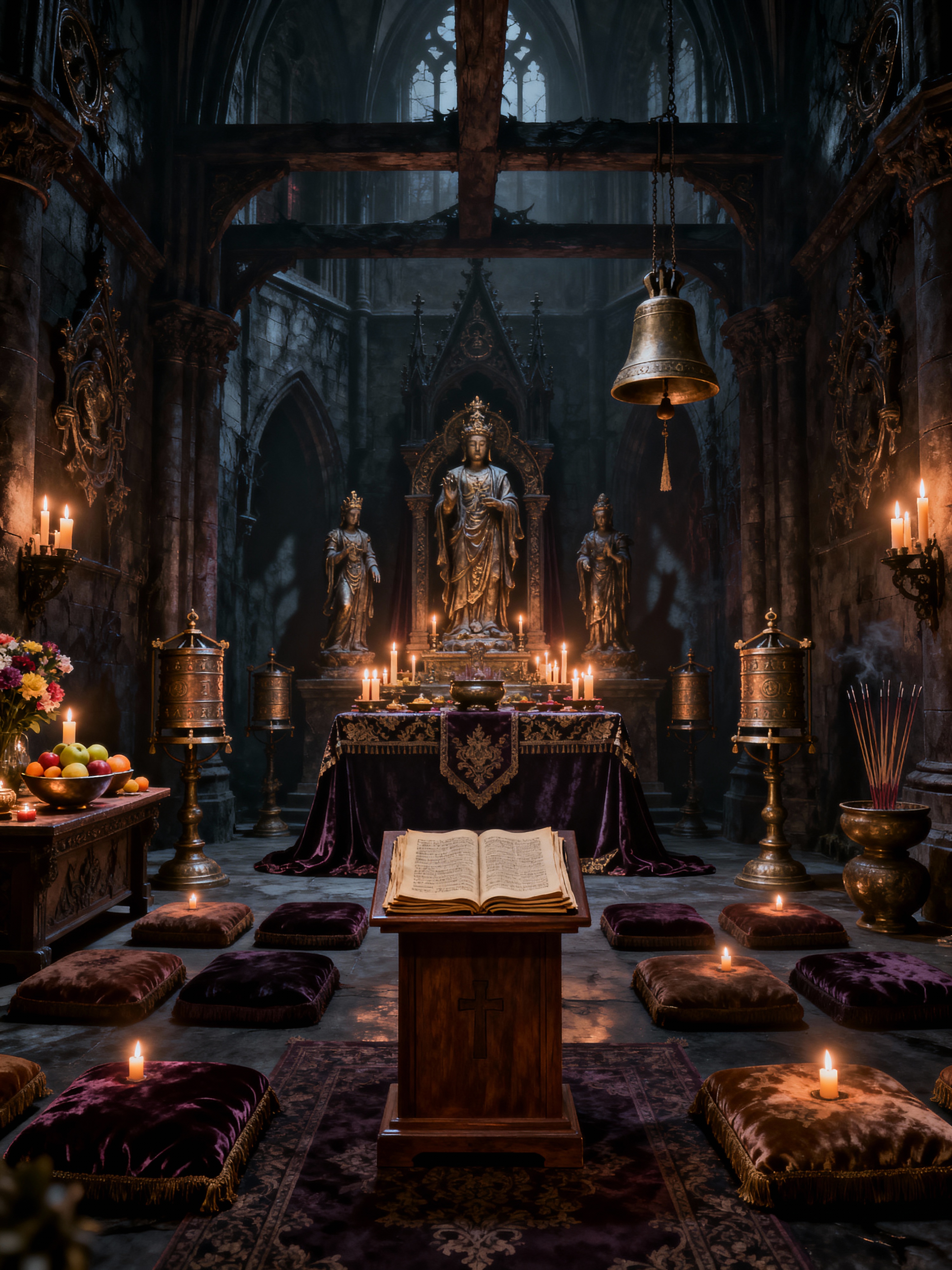 temple with gothic style with offerings bowl and sacred texts and prayer wheels and meditation cushions and incense burner and religious statues and altar and bells. . with dramatic atmosphere and dark colors and medieval influence and candlelit ambiance and cathedral style and mysterious mood and ornate details and rich fabrics