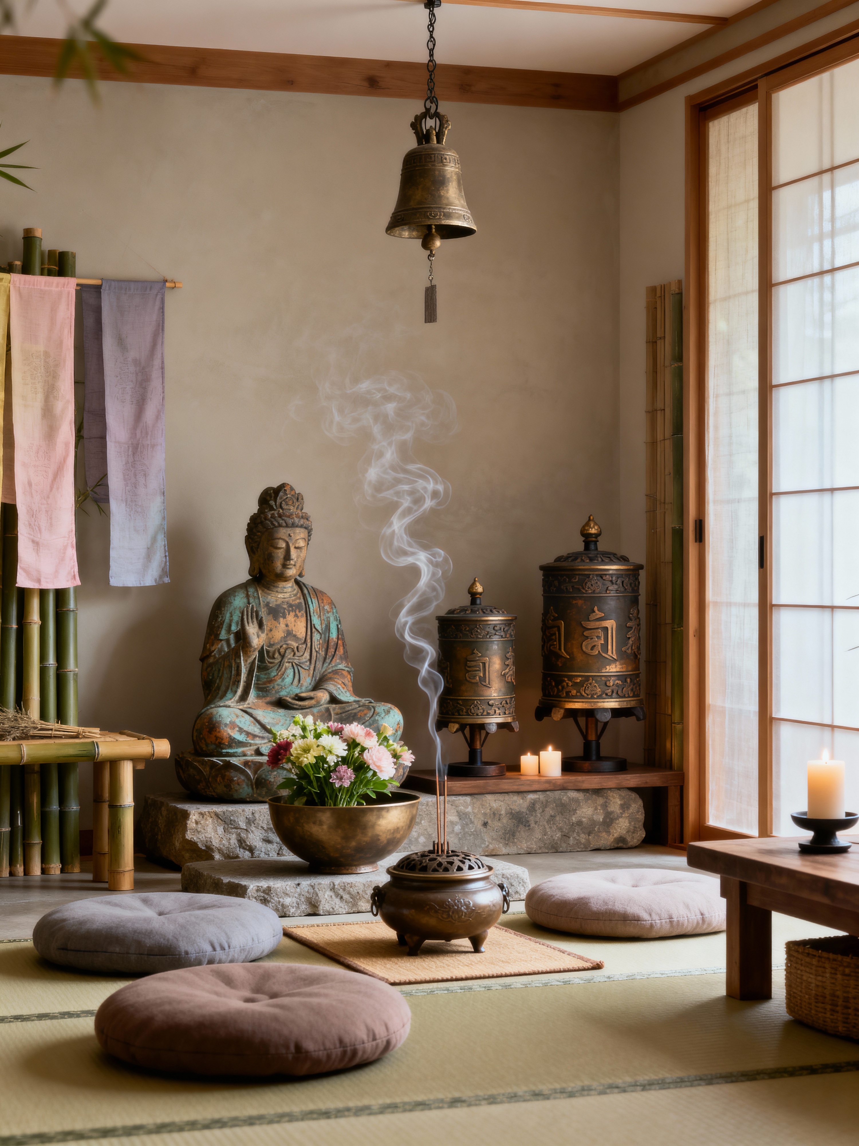temple with japanese design style with incense burner and meditation cushions and religious statues and bells and prayer flags and offerings bowl and prayer wheels and candles. . with neutral colors and tranquility and bamboo accents and wabi-sabi and low furniture and sliding doors and natural materials and tatami mats