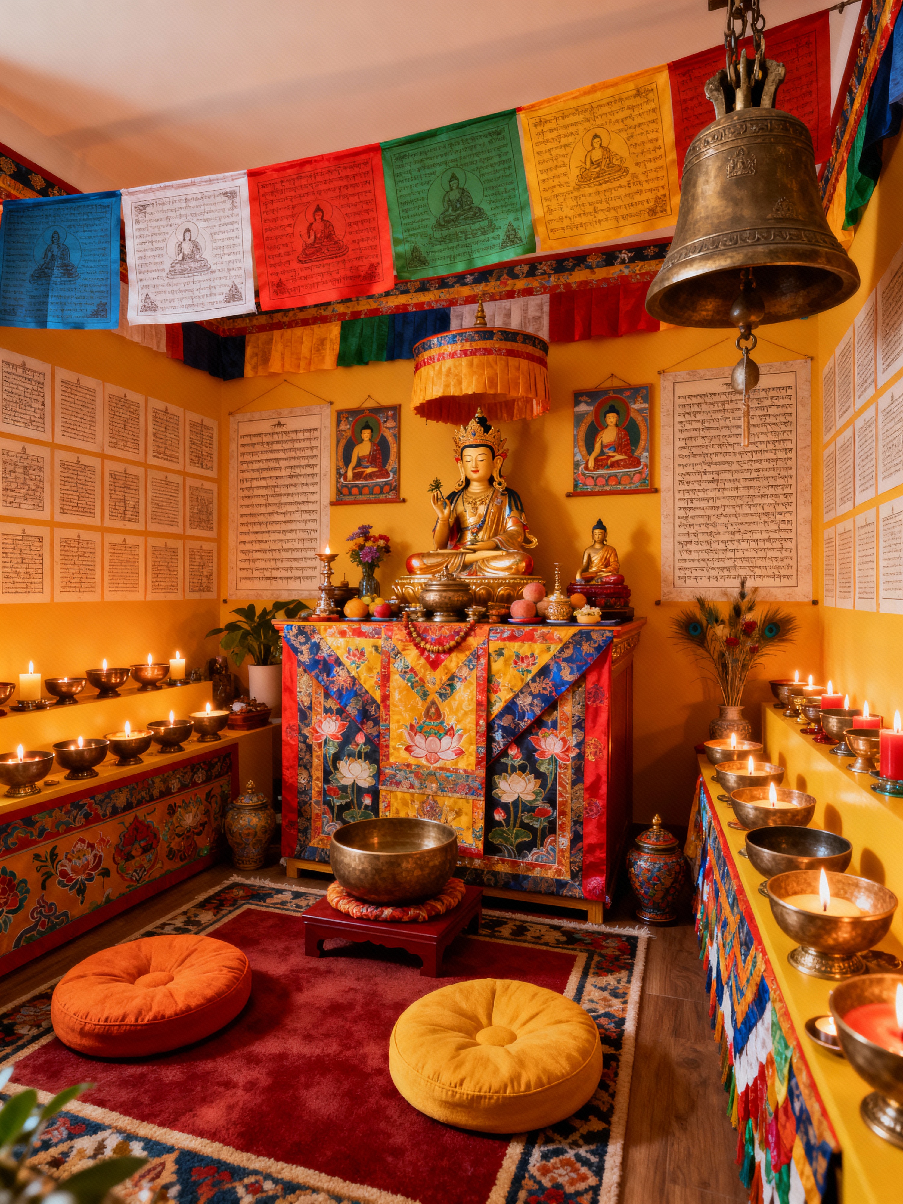 temple with maximalist style with sacred texts and candles and offerings bowl and prayer flags and meditation cushions and altar and bells and religious statues. . with over-the-top aesthetic and more is more philosophy and bold creativity and bold design and vibrant and bold colors and playful and bold patterns