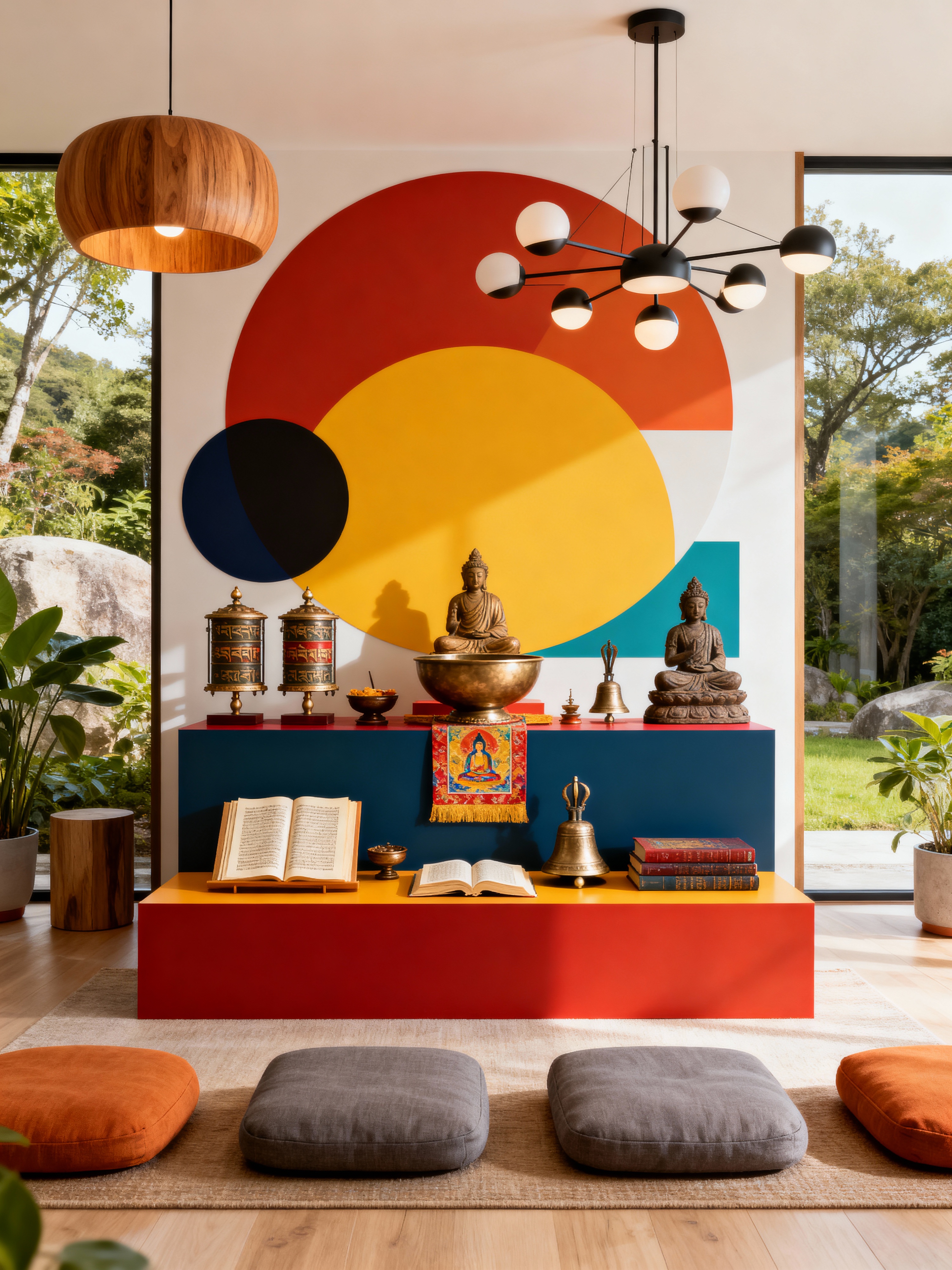 temple with midcentury modern style with offerings bowl and altar and candles and prayer wheels and meditation cushions and bells and sacred texts and religious statues. . with wood pendant light mid century modern chandelier and function over form and nature indoors and organic and geometric shapes and vibrant colors and graphic shapes and integrating indoor and outdoor motifs and mid century modern mobile chandelier