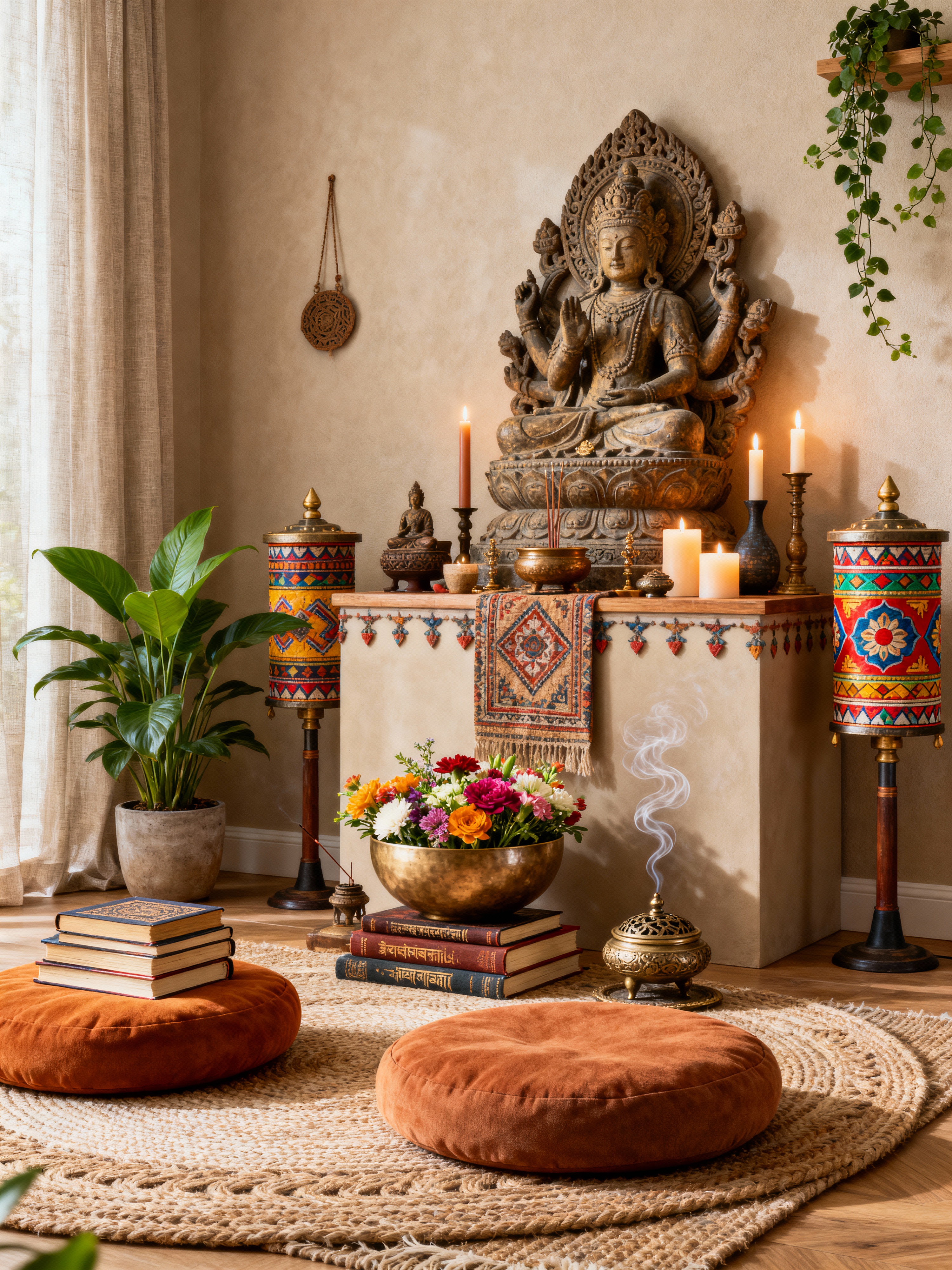 temple with modern boho style with meditation cushions and sacred texts and offerings bowl and religious statues and altar and candles and prayer wheels and incense burner. . with warm colors and unique finds and comfortable and handcrafted items and neutral palette and expressive decor and collected look and greenery