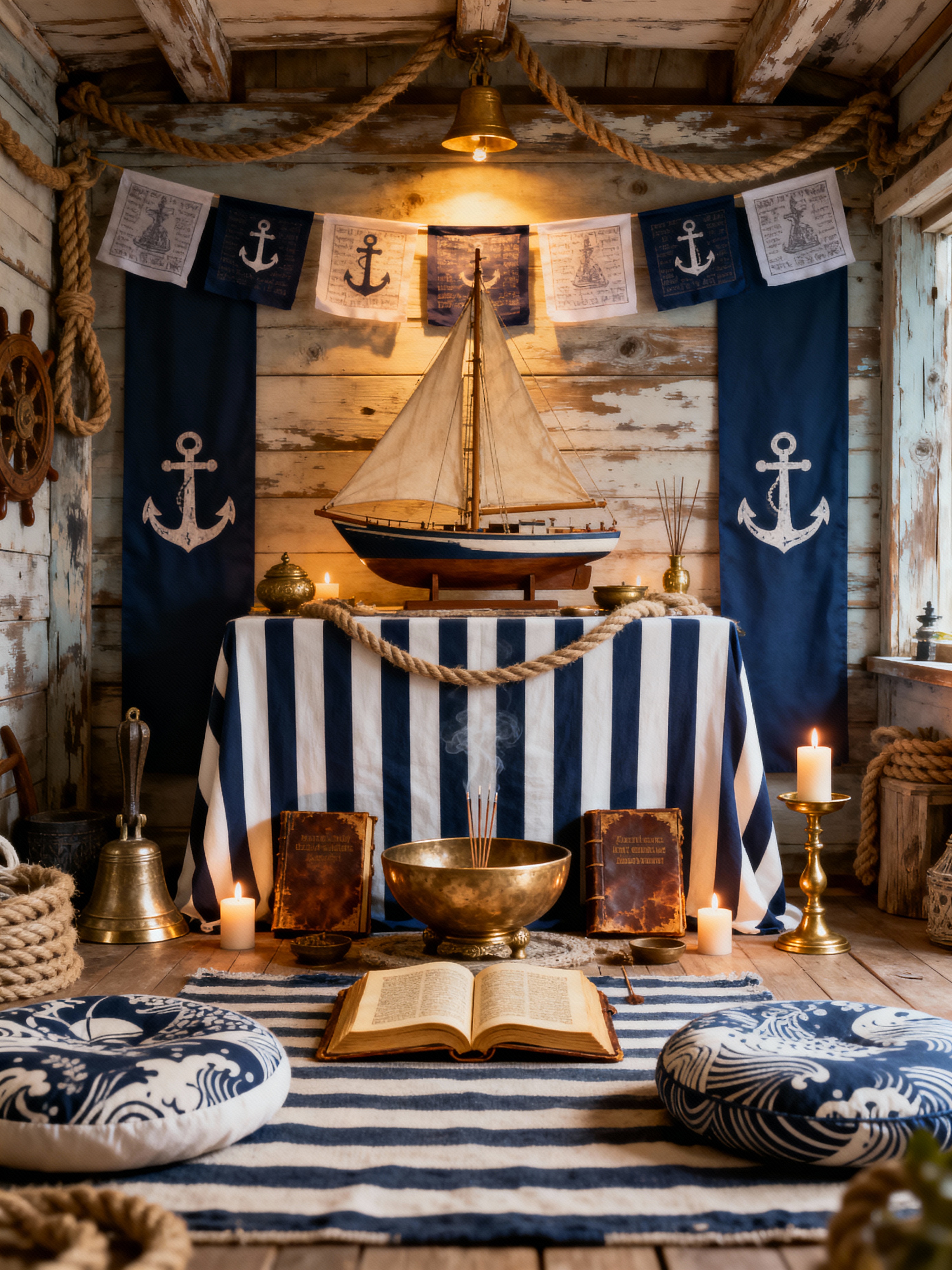 temple with nautical style with sacred texts and offerings bowl and altar and incense burner and bells and meditation cushions and prayer flags and candles. . with striped patterns and maritime decor and sailboat elements and anchor motifs and coastal vibes and weathered wood and rope details and navy blue