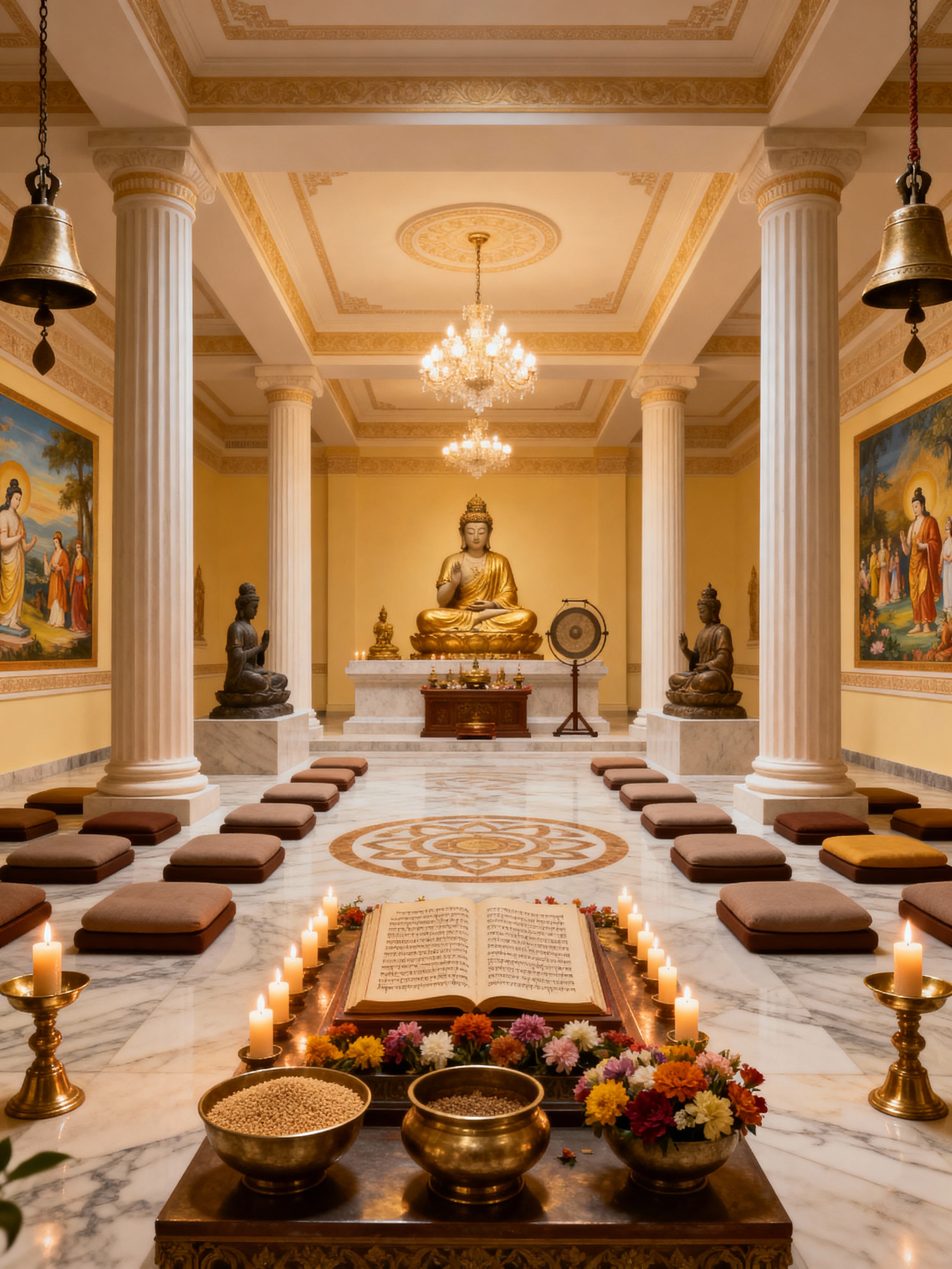temple with neoclassic style with meditation cushions and religious statues and altar and sacred texts and prayer wheels and candles and offerings bowl and bells. . with geometric decorative elements and classical architectural details and emphasized horizontal and vertical lines and spacious rooms and greek columns and timeless artwork and elegant and sophisticated and symmetric layouts