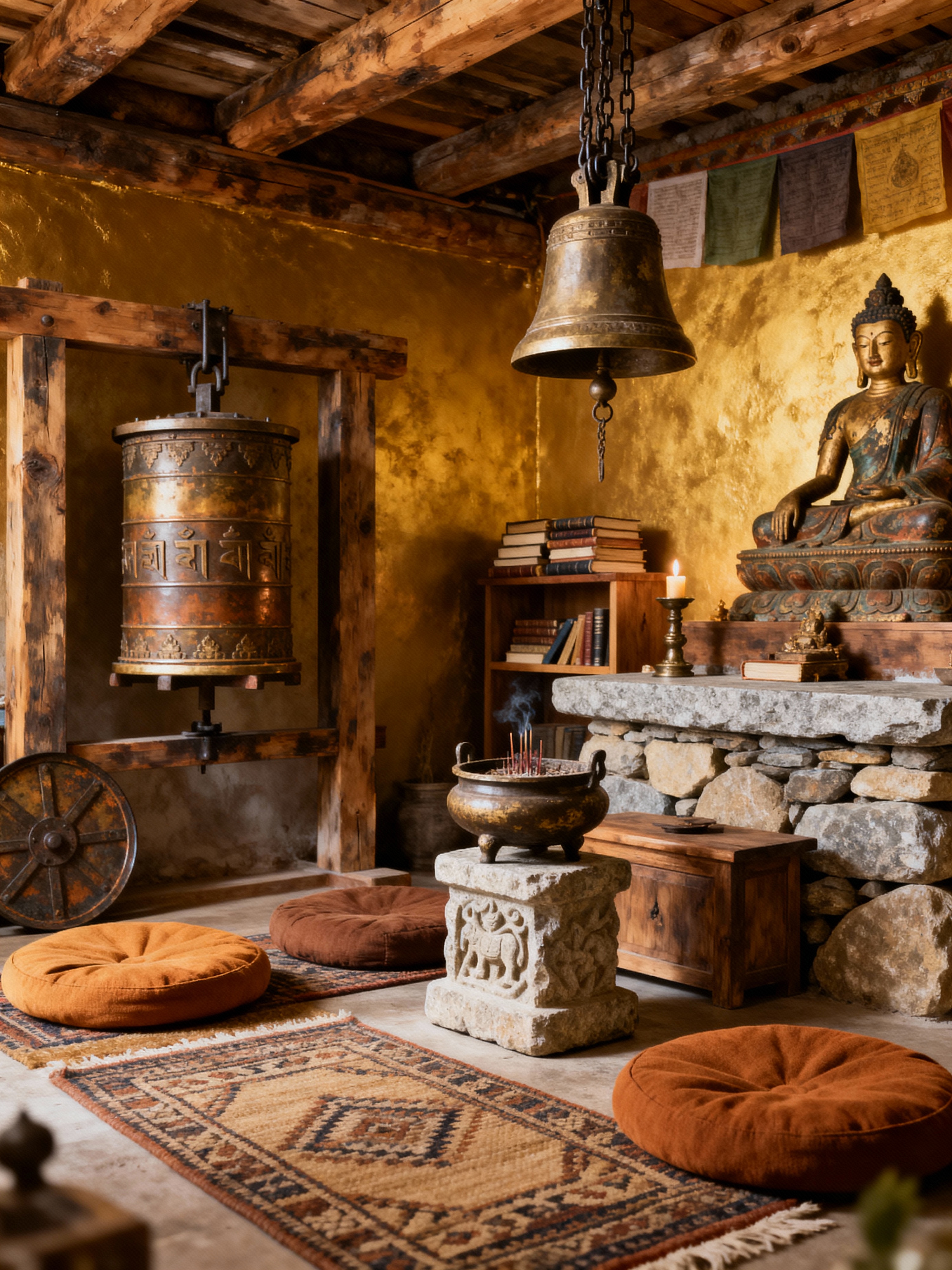 temple with rustic style with prayer wheels and meditation cushions and incense burner and bells and religious statues and sacred texts and altar and prayer flags. . with distressed finishes and iron fixtures and country style and natural wood and woven textures and stone accents and warmth and exposed beams