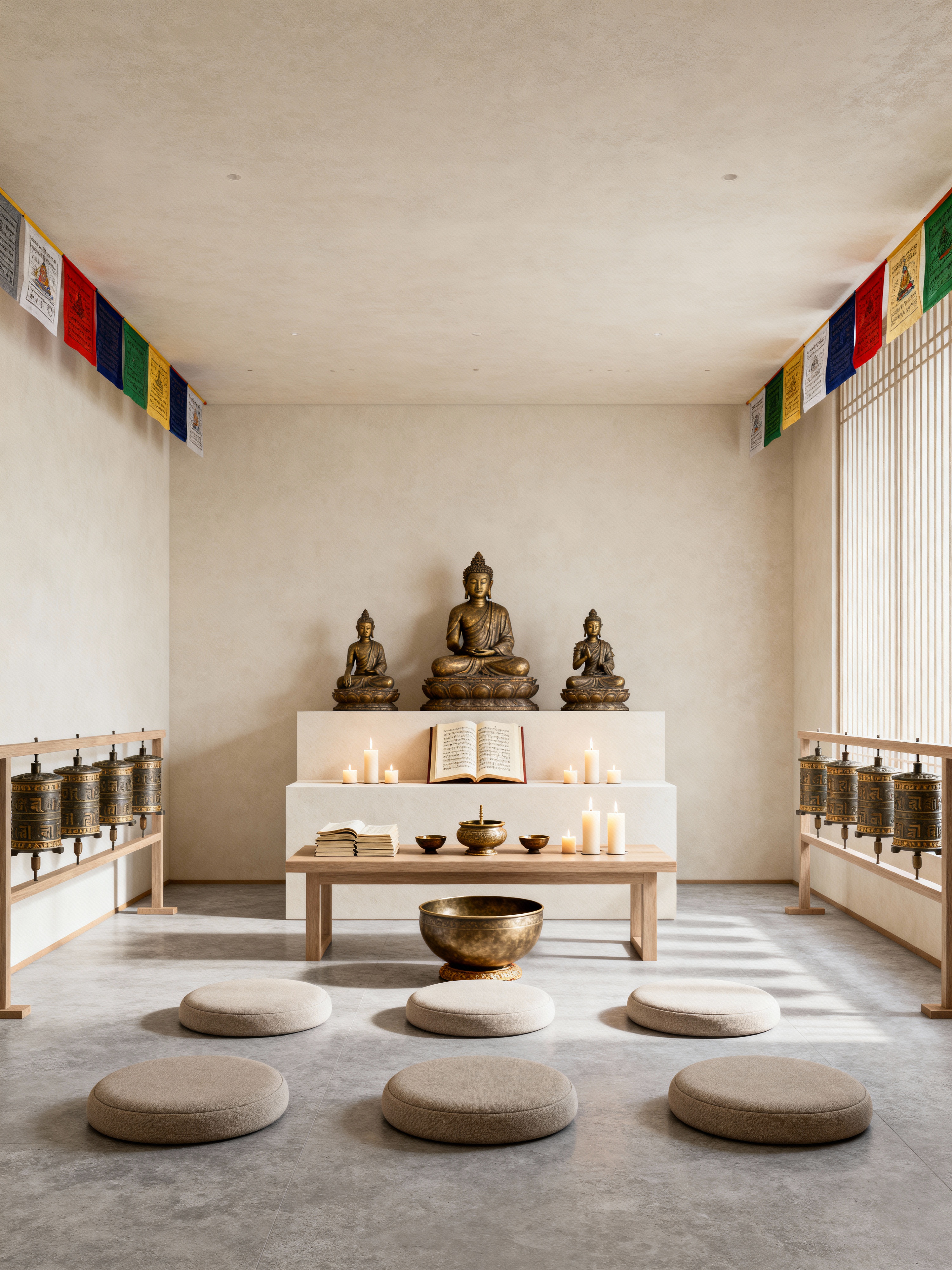 temple with simple style with altar and offerings bowl and sacred texts and religious statues and candles and meditation cushions and prayer flags and prayer wheels. . with pure simplicity and understated style and clean design and calm atmosphere and streamlined look and neutral colors and uncluttered space and minimal decor