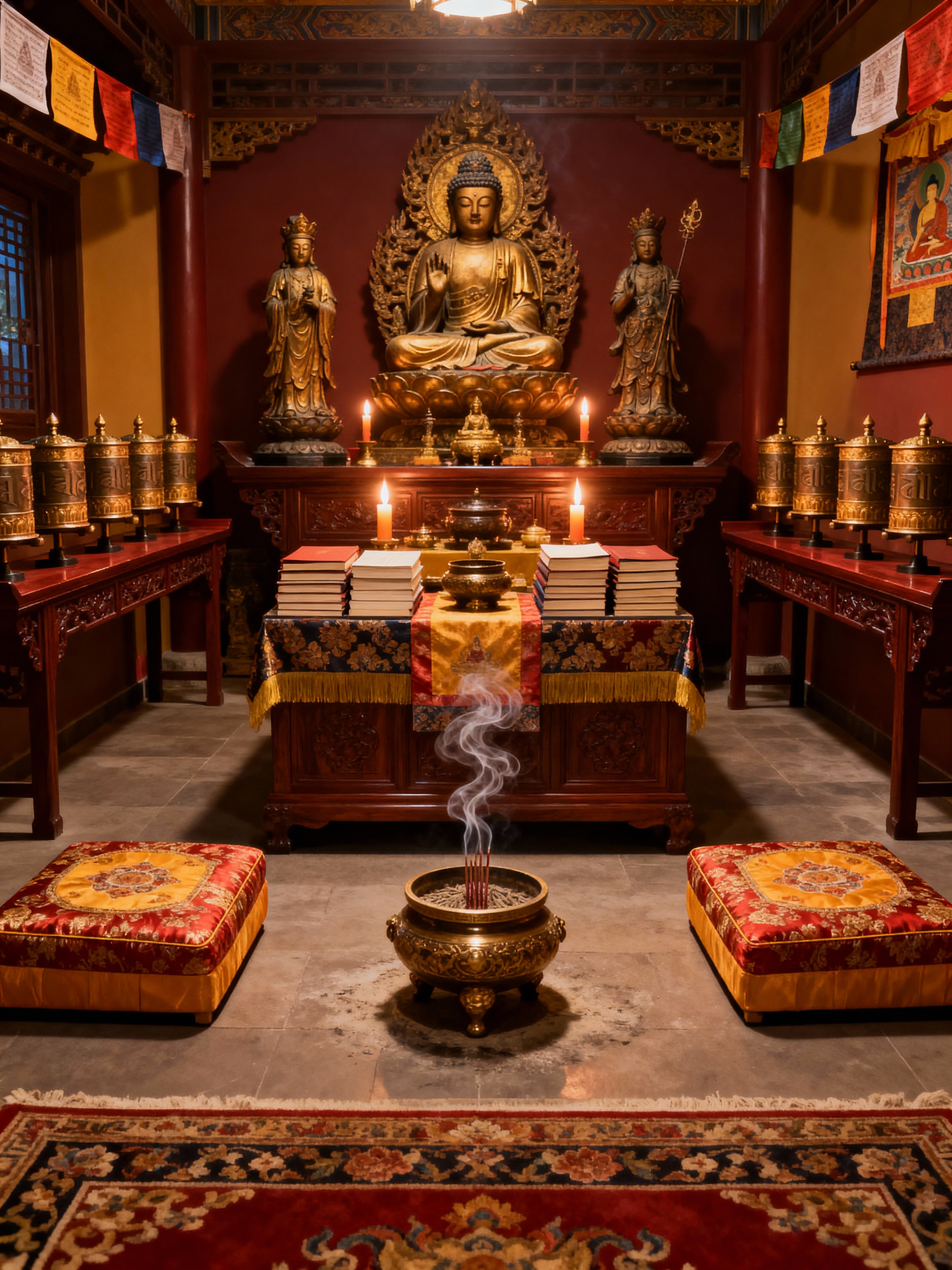 temple with traditional style with meditation cushions and altar and sacred texts and prayer flags and incense burner and candles and prayer wheels and religious statues. . with rich fabrics and classic elegance and symmetrical layout and warm colors and ornate details and luxurious textiles and antique pieces and refined atmosphere