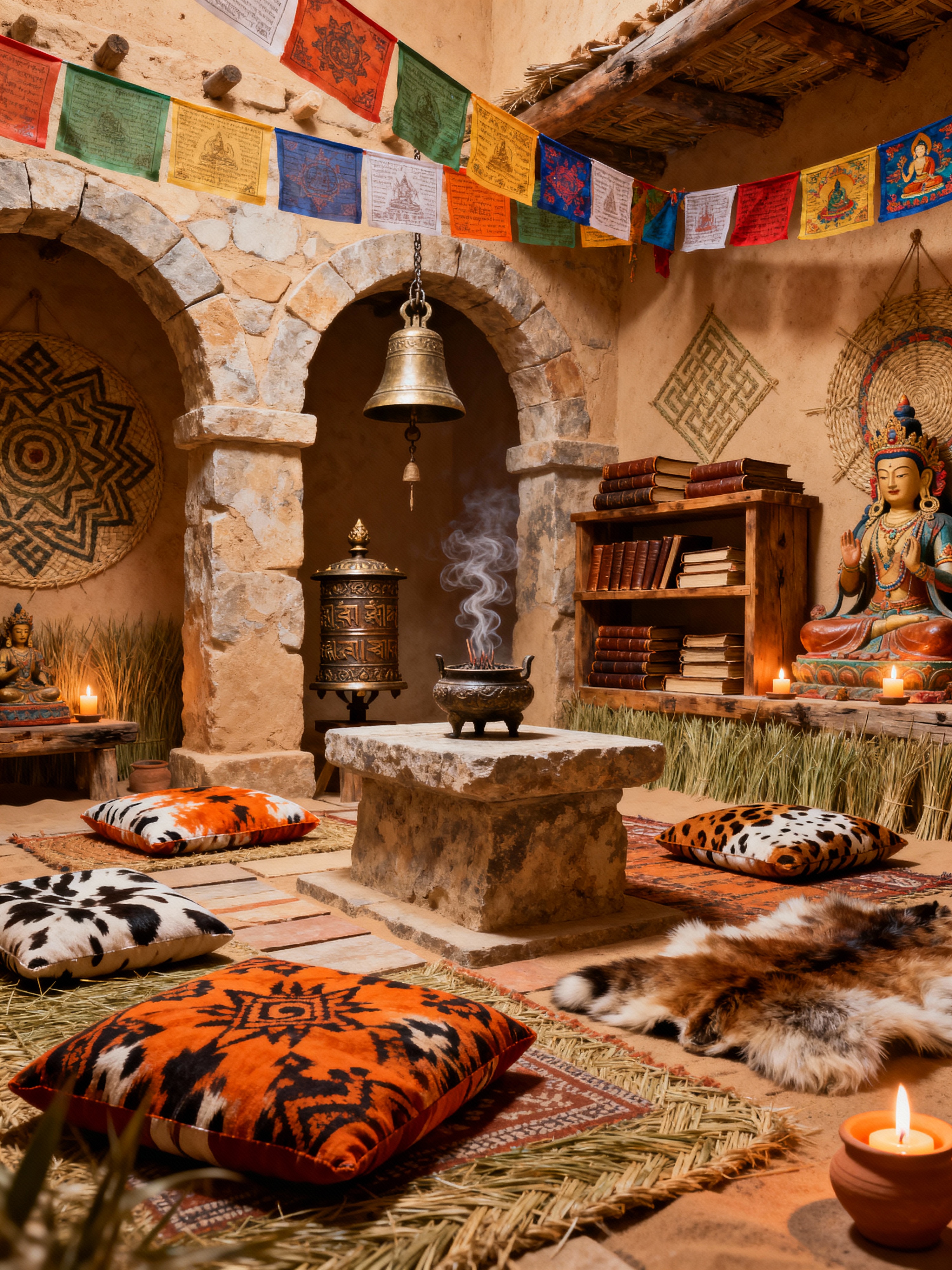 temple with tribal style with meditation cushions and bells and incense burner and prayer wheels and sacred texts and prayer flags and religious statues and candles. . with desert colours and planks of stone and hand dyed batik fabrics and intricate grass weaving and animal furslinen and smooth worn timbers and exuberant splashes of colour and animal prints