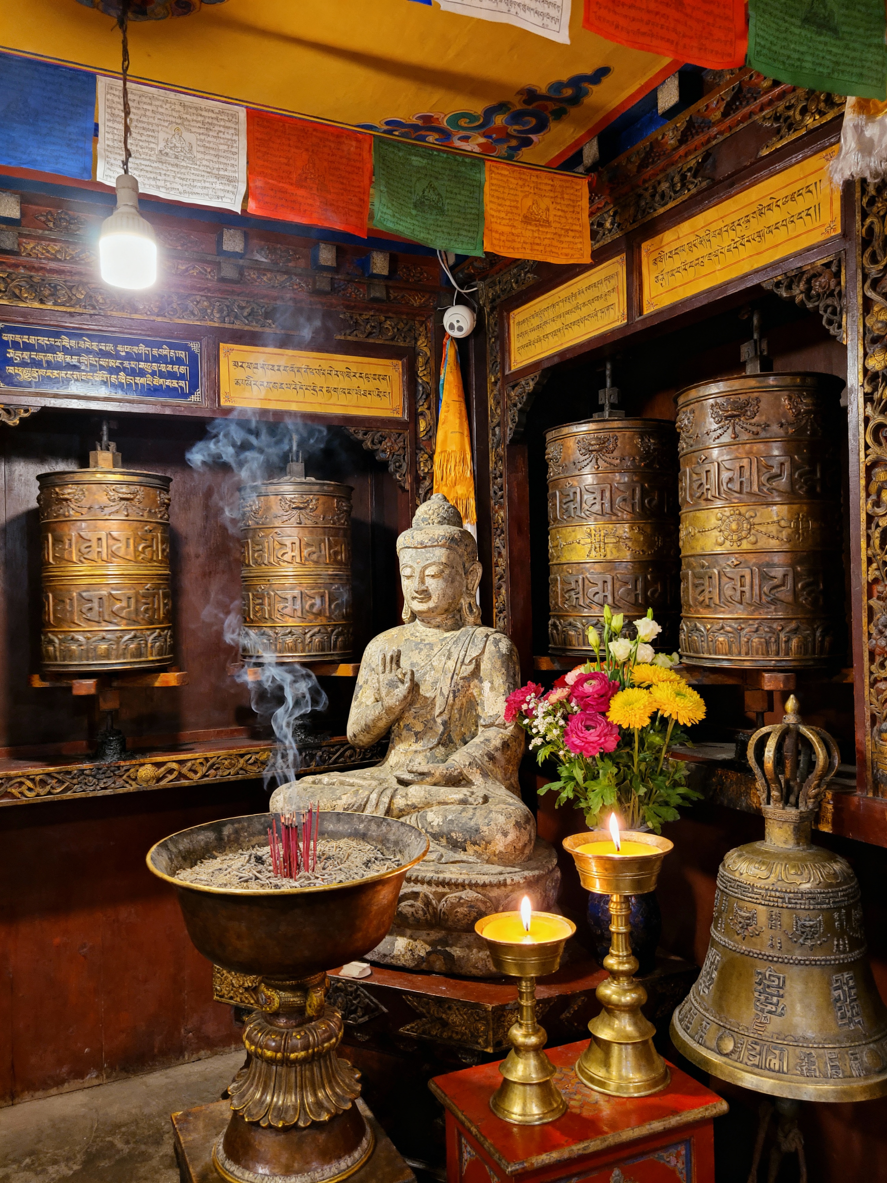 temple with vintage style with sacred texts and prayer wheels and prayer flags and candles and incense burner and offerings bowl and religious statues and bells. . with ornate details and retro style and antique decor and nostalgic feel and colorful accents and timeless pieces and bold patterns and mid-century