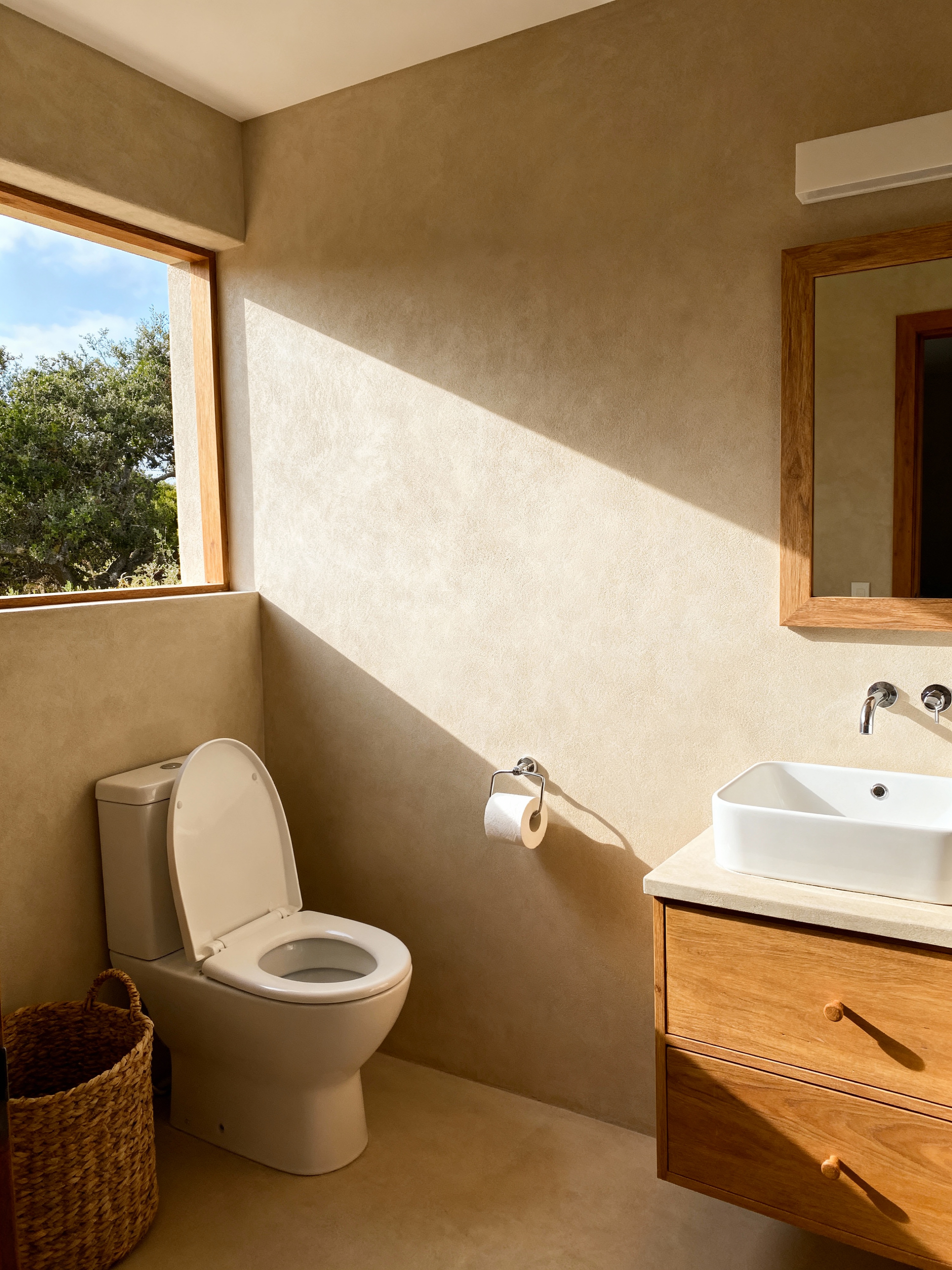 toilet with airbnb style with toilet with toilet seat up and toilet paper hanger and sink with tap and toilet with toilet seat up. . with natural materials and elements and open and natural lighting and scandinavian style and neutral walls and textures and simple color palette and practicality and functionality and simple, clean lines and simplistic furniture and natural materials and elements