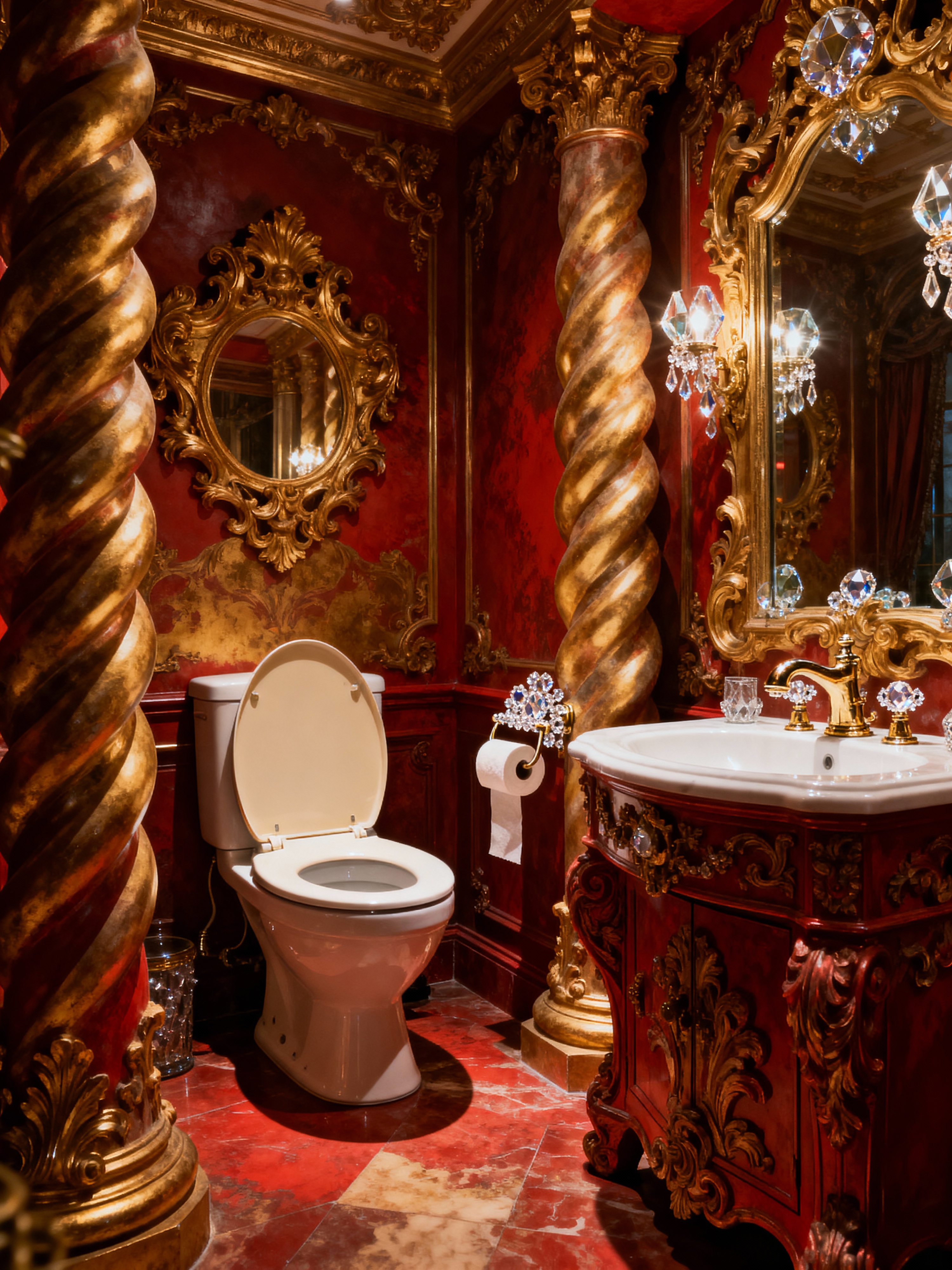 toilet with baroque style with toilet paper hanger and sink with tap and toilet with toilet seat up and toilet paper hanger. . with twisted columns and drama and sensuous richness and dynamism and opulent and colossal furniture and crystal and glass accents and tension and movement