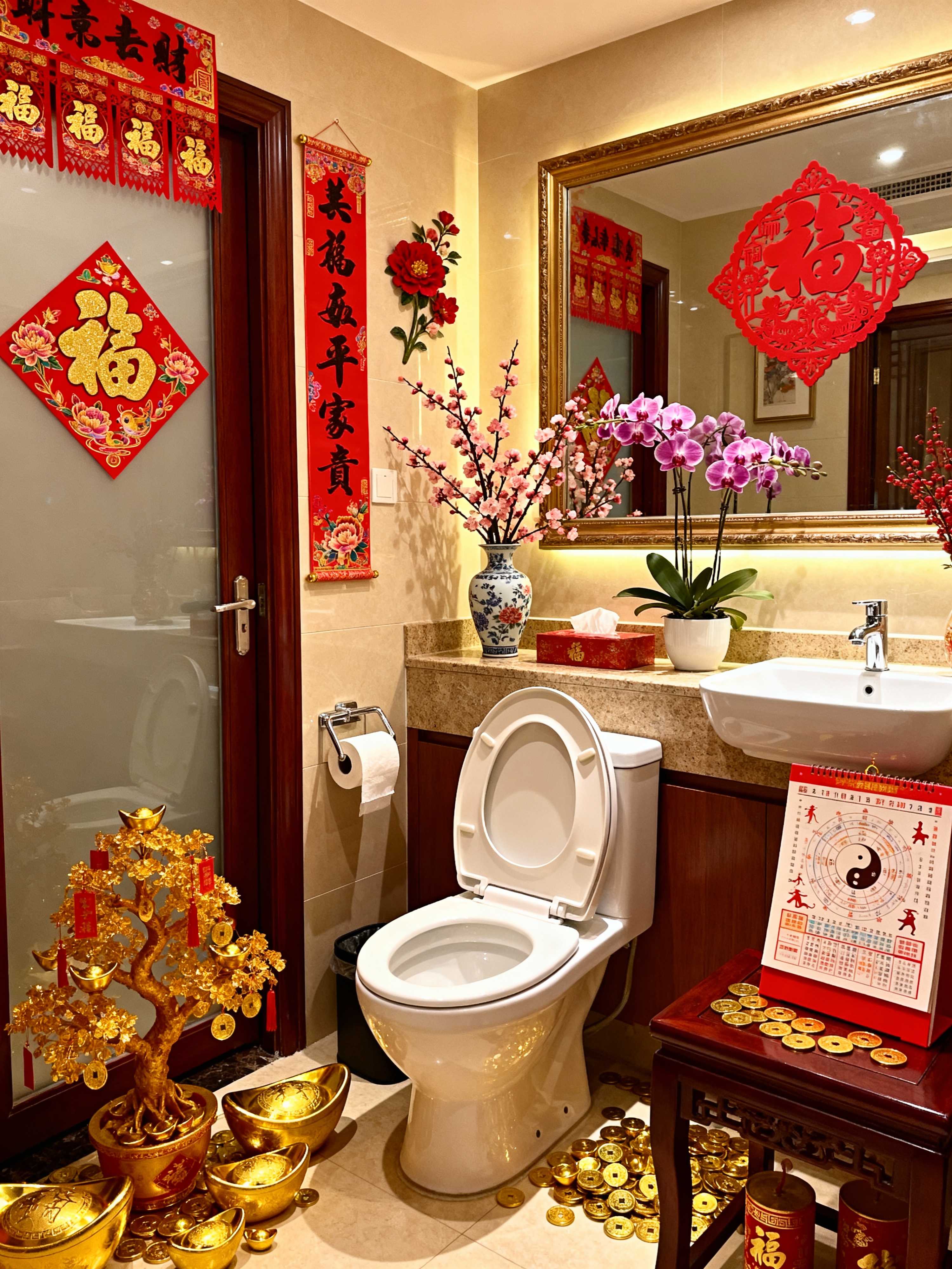 toilet with chinese new year style with sink with tap and toilet paper hanger and toilet with toilet seat up and sink with tap. . with vases of plum blossoms and orchids and paper cuttings and door couplets and mei hwa flowers and fai chun banners and gold ingots and money tree and zodiac calendar