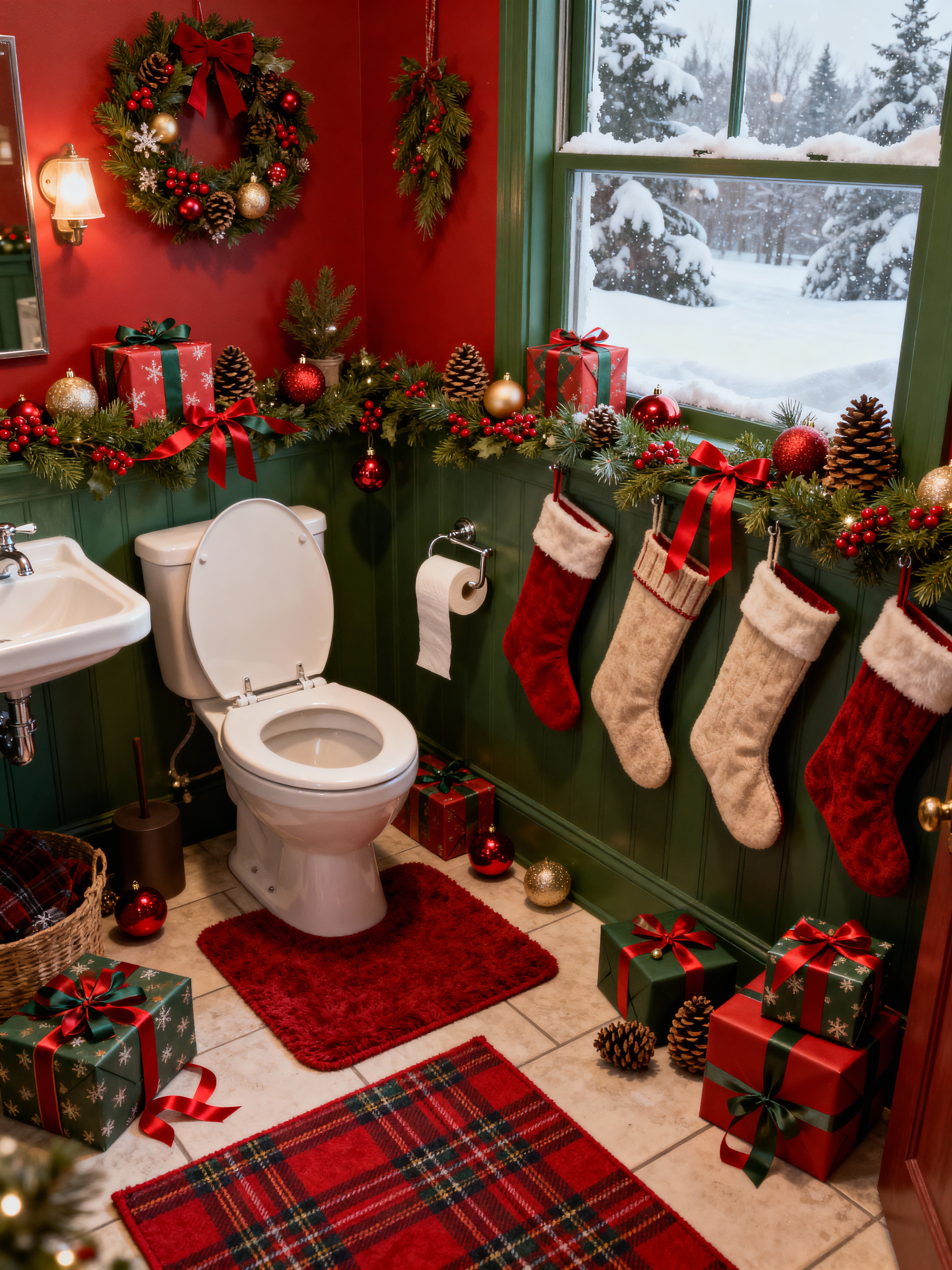 toilet with christmas style with toilet paper hanger and toilet with toilet seat up and sink with tap and toilet paper hanger. . with giftwrapped gifts and christmas ornaments and snow outside and tie pinecones and berries and berries and greenery draped and a few big socks hanging and ribbons and plaid rugs
