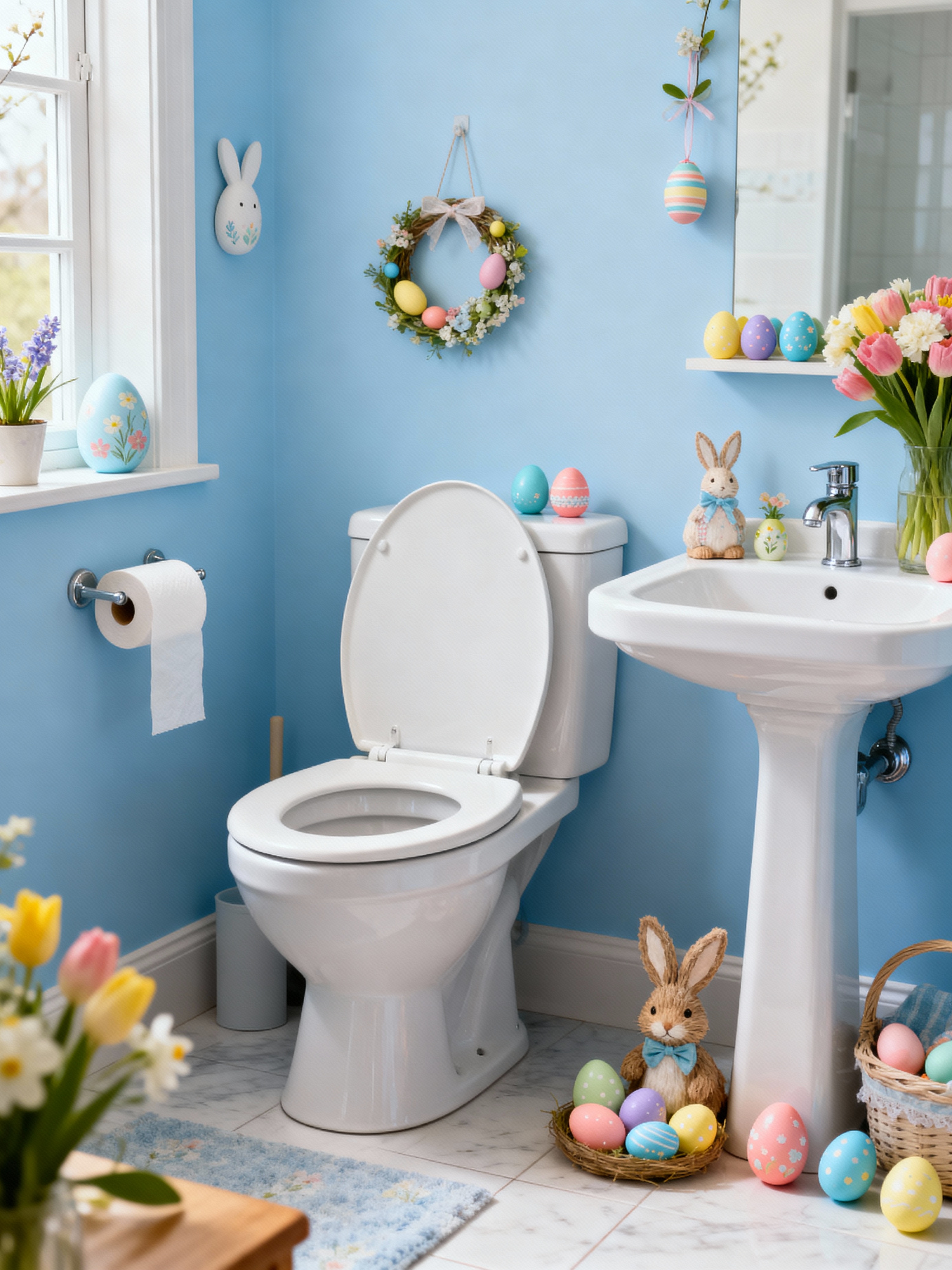 toilet with easter style with toilet paper hanger and toilet with toilet seat up and sink with tap and toilet paper hanger. . with easter decorations and flowers on table and spring decorations and light blue colors and colorful easter eggs and easter decorations