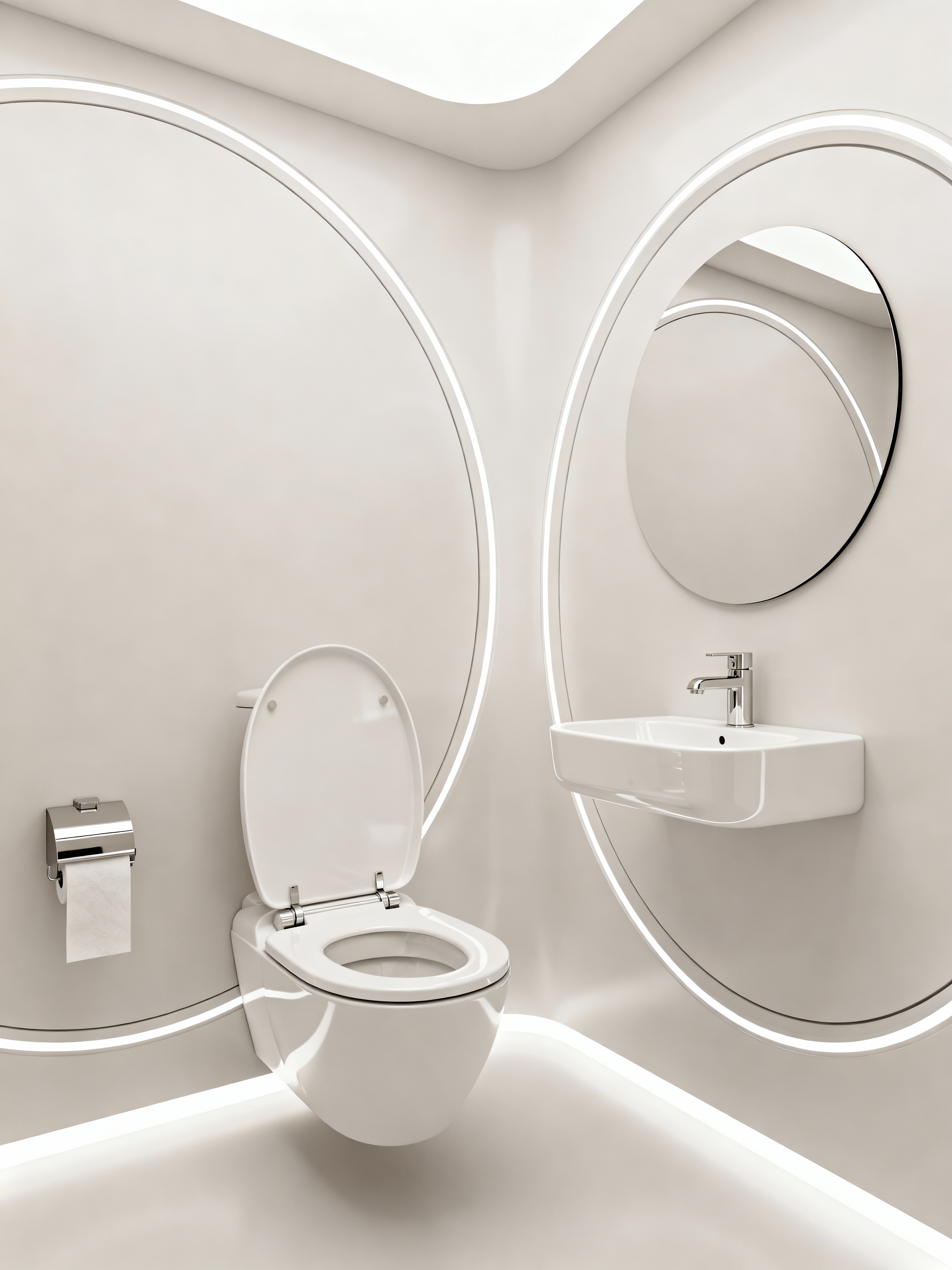 toilet with futuristic style with sink with tap and toilet with toilet seat up and toilet paper hanger and sink with tap. . with monochromatic palette and light colors and spaceship interior and futurism and futurism minimalist interior and circular shapes and neutral background and bright accents and strong geometric walls
