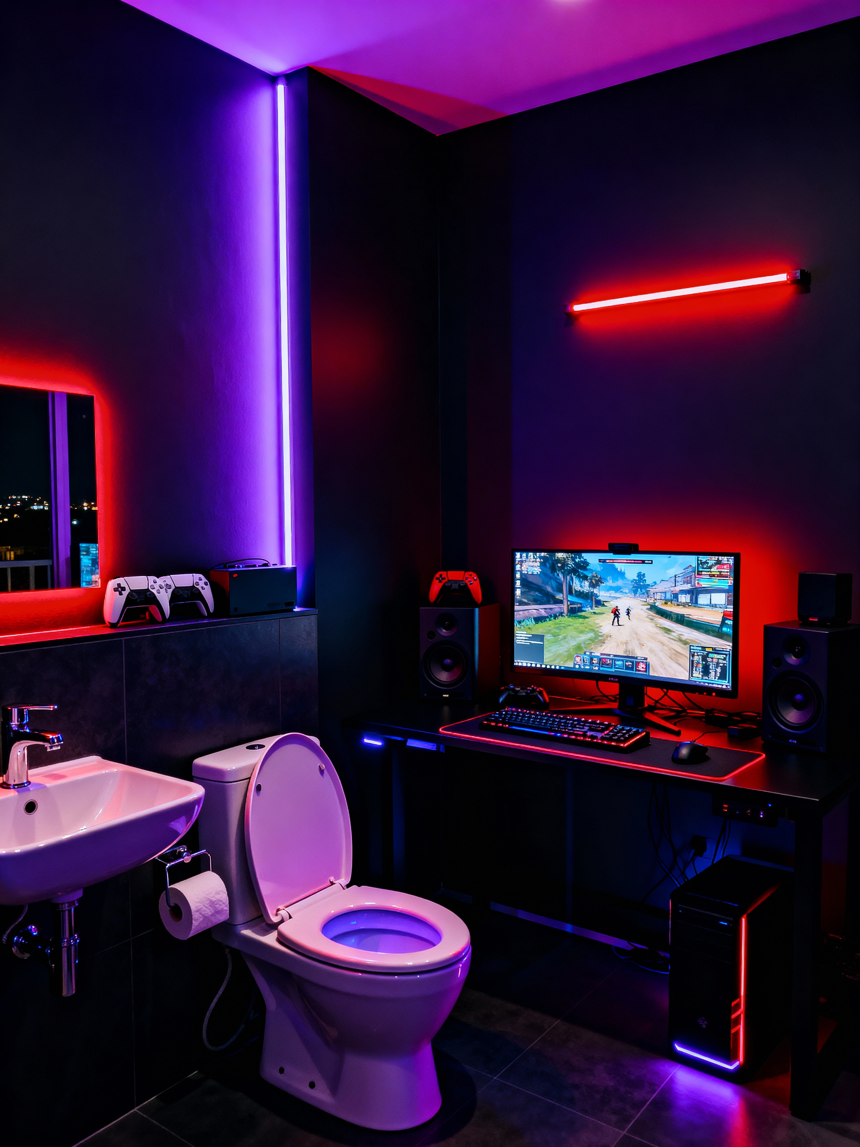 toilet with gaming room style with sink with tap and toilet with toilet seat up and toilet paper hanger and sink with tap. . with video game consoles and purple and red lights and computer desk with computer displays and keyboard and at night and dark lit room and neon lights and dark walls and speakers