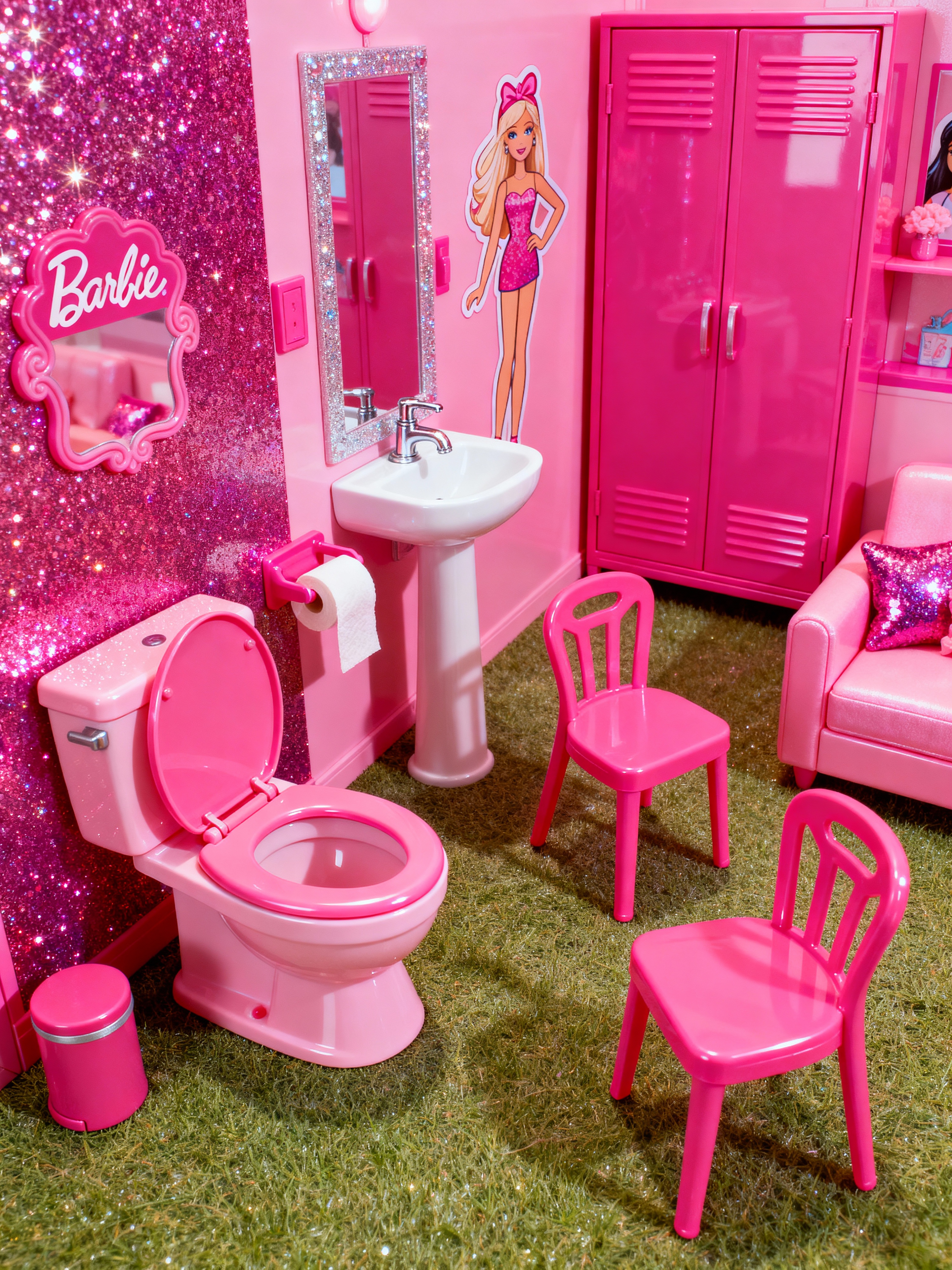 toilet with hot pink style with sink with tap and toilet paper hanger and toilet with toilet seat up and sink with tap. . with barbie plastic interior and hot pink barbie walls and barbie chairs and hot pink barbie colors and barbie sofa and barbie glitter and sparkle and barbie bold rosy hues like fuchsia and magenta and barbie closet