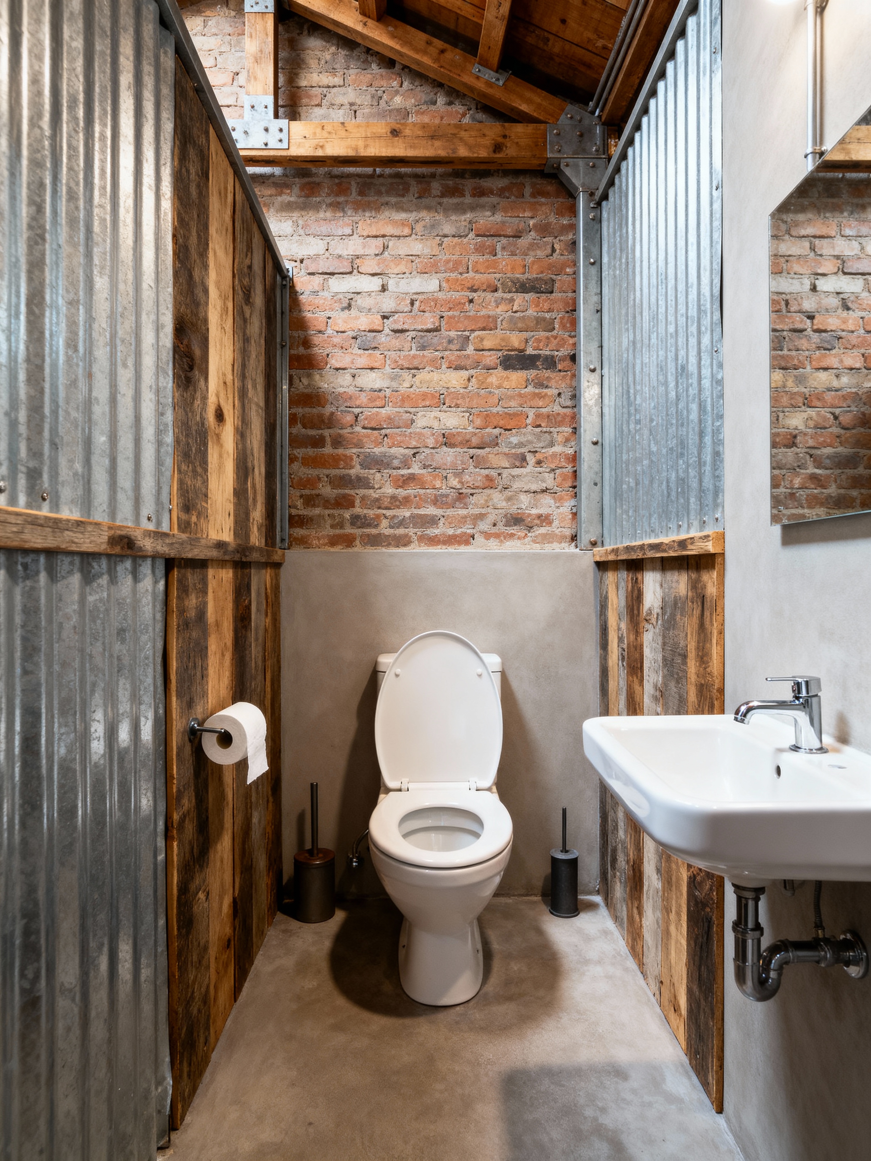 toilet with industrial style with toilet with toilet seat up and toilet paper hanger and sink with tap and toilet with toilet seat up. . with open floorplan and neutral tones and exposed brick and reclaimed wood and metal panels and exposed rafters and utilitarian objects and factory style