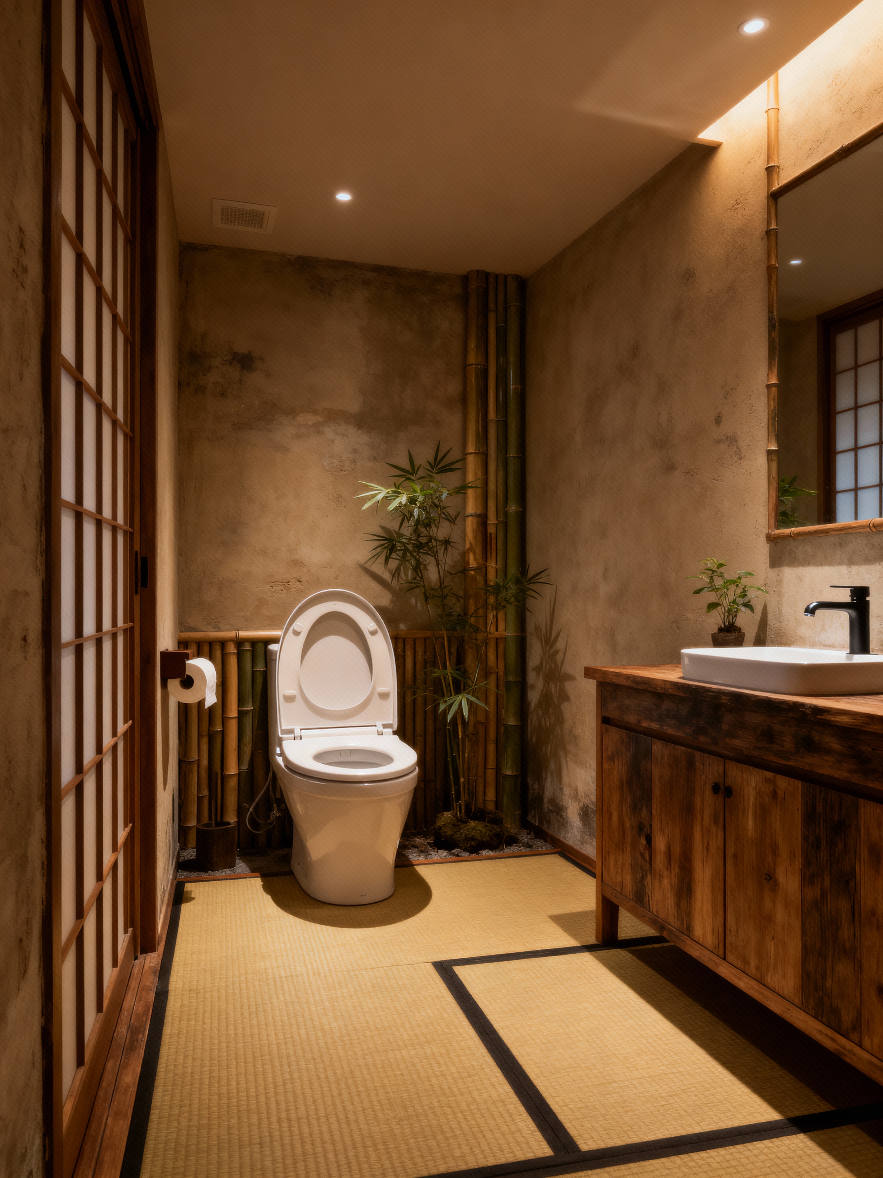 toilet with japanese design style with toilet with toilet seat up and toilet paper hanger and sink with tap and toilet with toilet seat up. . with tatami mats and wabi-sabi and tranquility and bamboo accents and natural materials and low furniture and sliding doors and indoor plants
