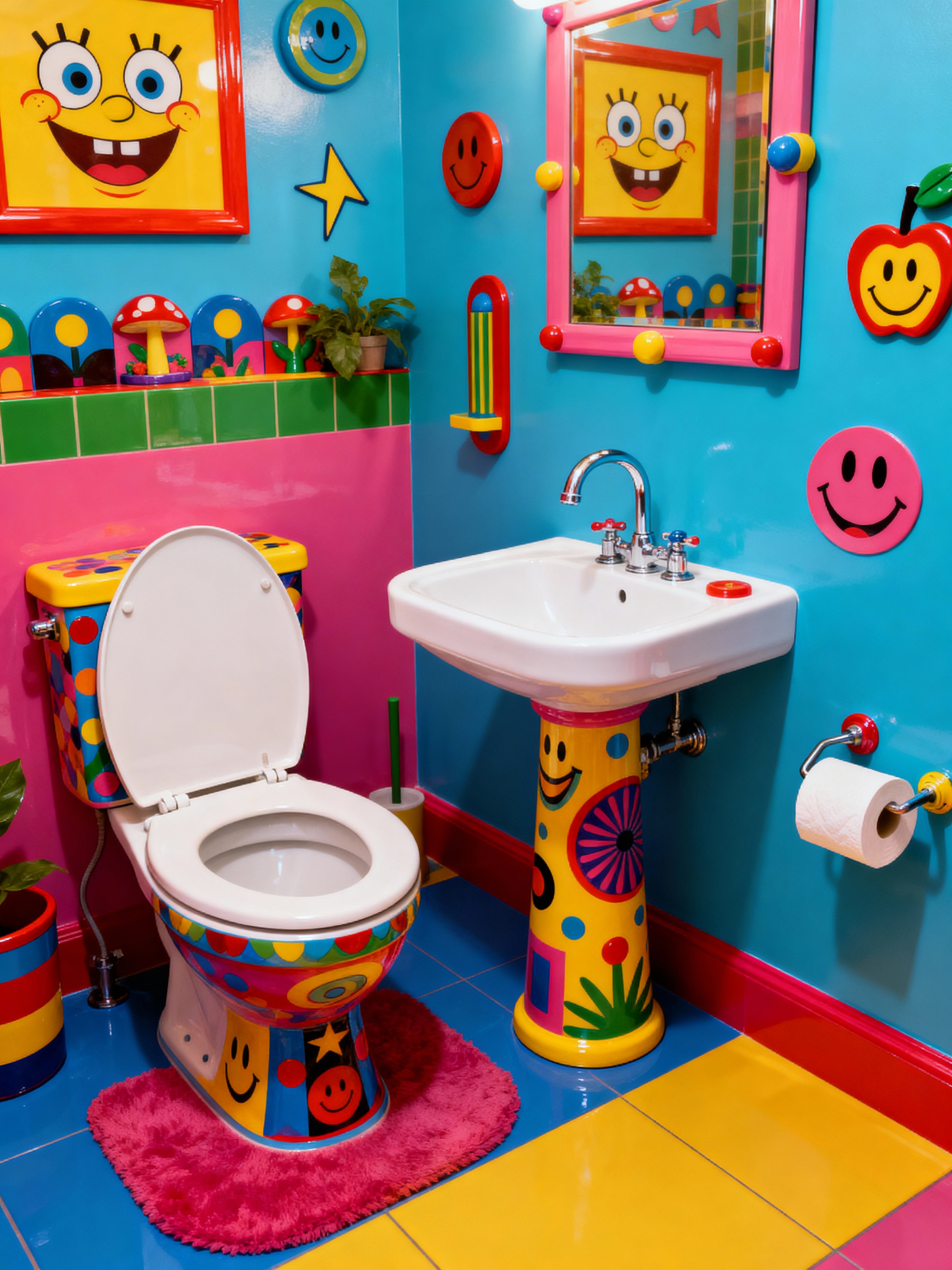 toilet with maximalist style with sink with tap and toilet paper hanger and toilet with toilet seat up and sink with tap. . with over-the-top aesthetic and playful and eye-catching and bold creativity and vibrant and bold design and more is more philosophy and bold colors