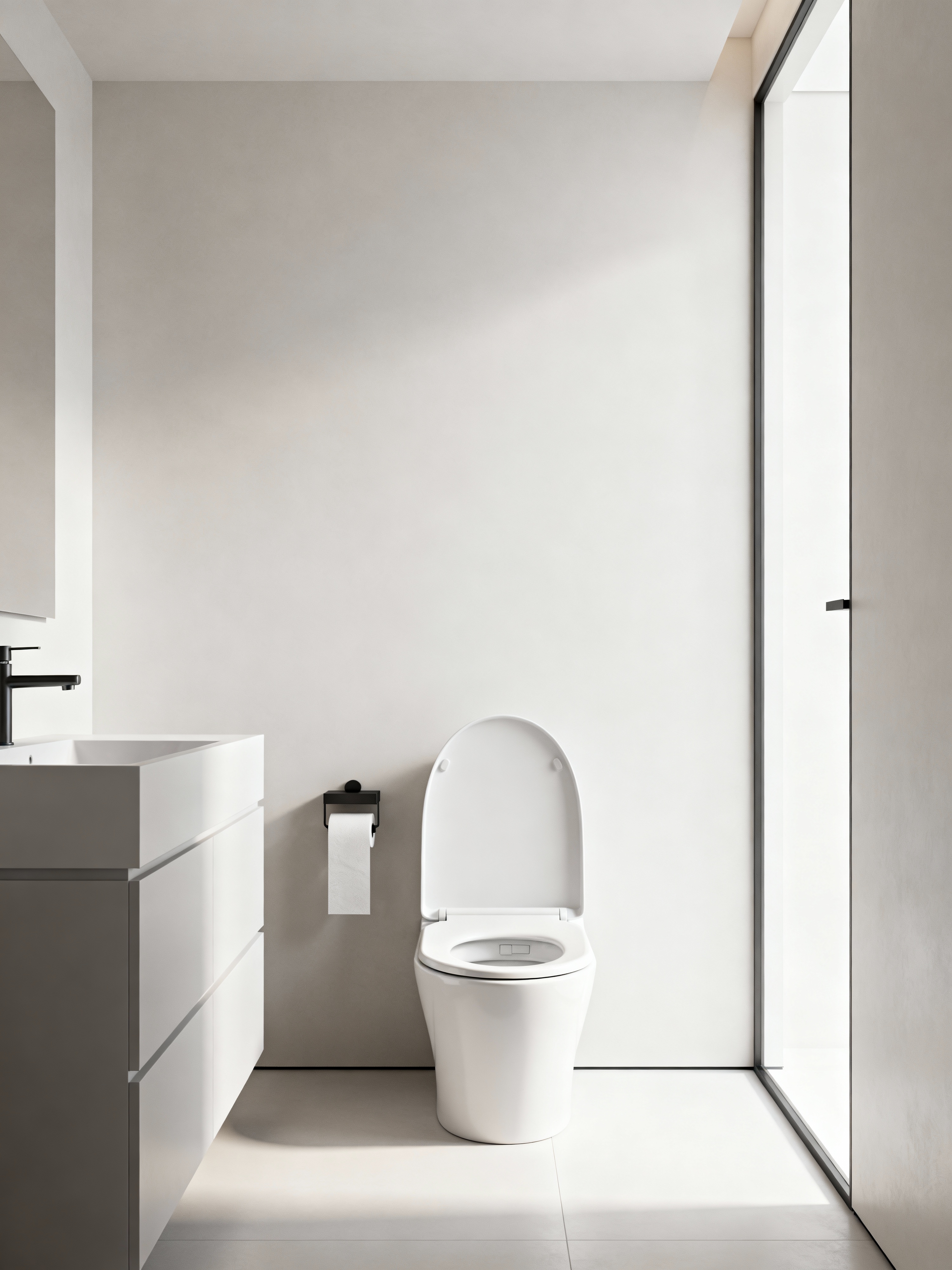 toilet with minimalist style with toilet with toilet seat up and toilet paper hanger and sink with tap and toilet with toilet seat up. . with an open floor plan and clean lines and focus on the shape, colour and texture of just a few of essential elements and a monochromatic palette with colour used as an accent and functional furniture and lots of light and an open floor plan
