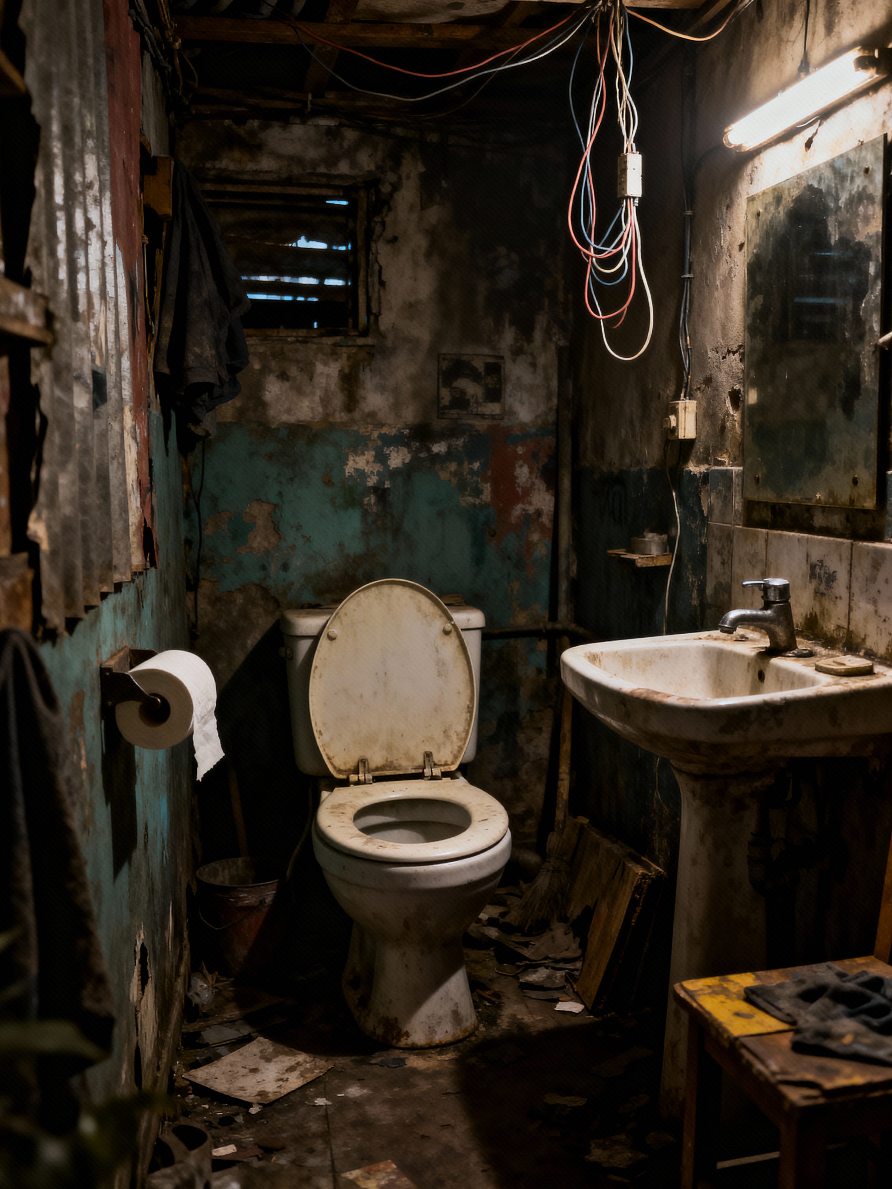 toilet with post-apocalyptic style with toilet with toilet seat up and sink with tap and toilet paper hanger and toilet with toilet seat up. . with abandoned look and weathered materials and survival-inspired and dim lighting and makeshift furniture and hanging exposed wires and run-down favela style and worn textures