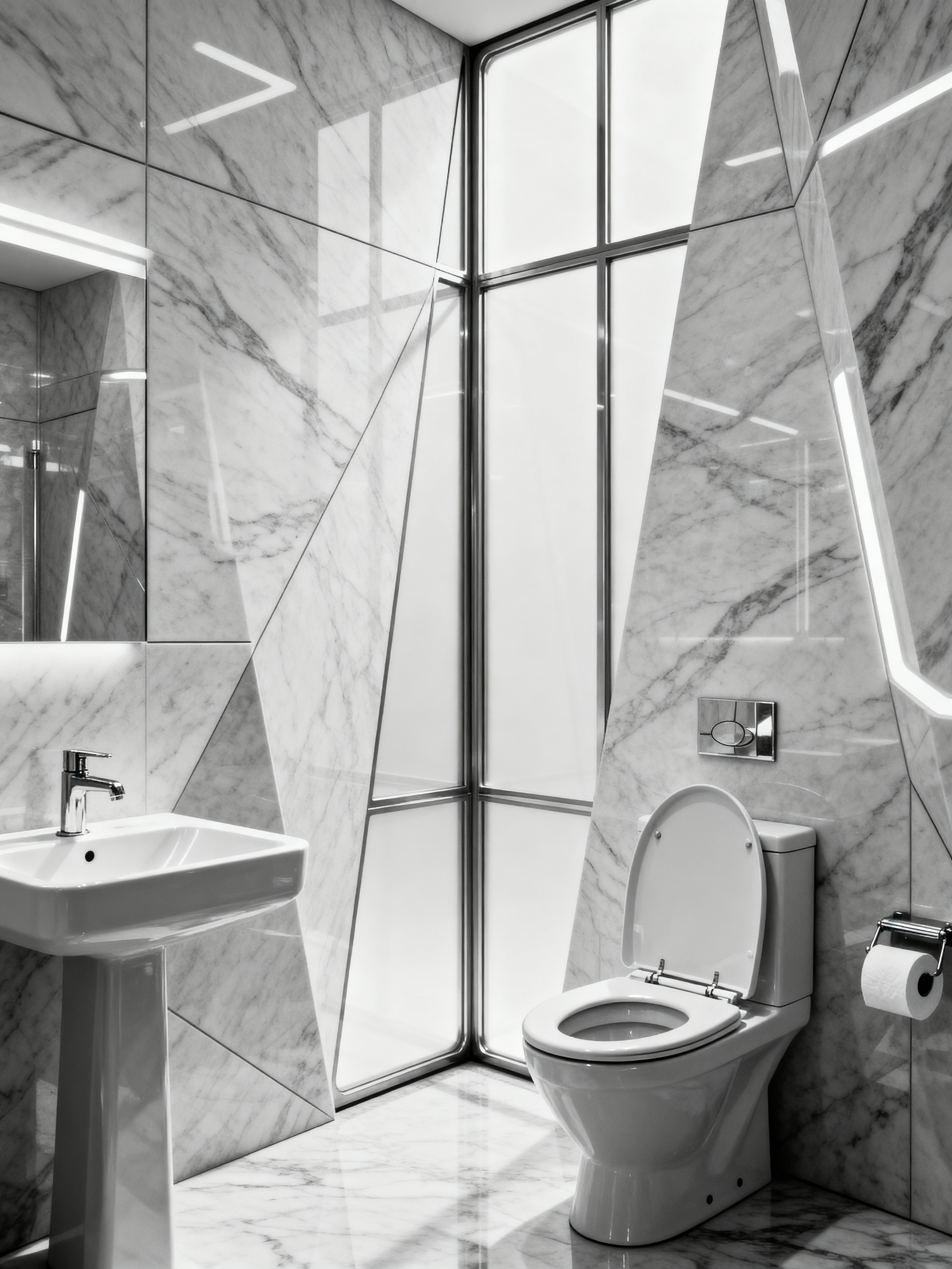 toilet with retro futuristic style with sink with tap and toilet with toilet seat up and toilet paper hanger and sink with tap. . with strong geometric walls and smooth polished marble and glass panes and futurism minimalist interior and vintage futurism and monochromatic palette and light colors and futuristic interior