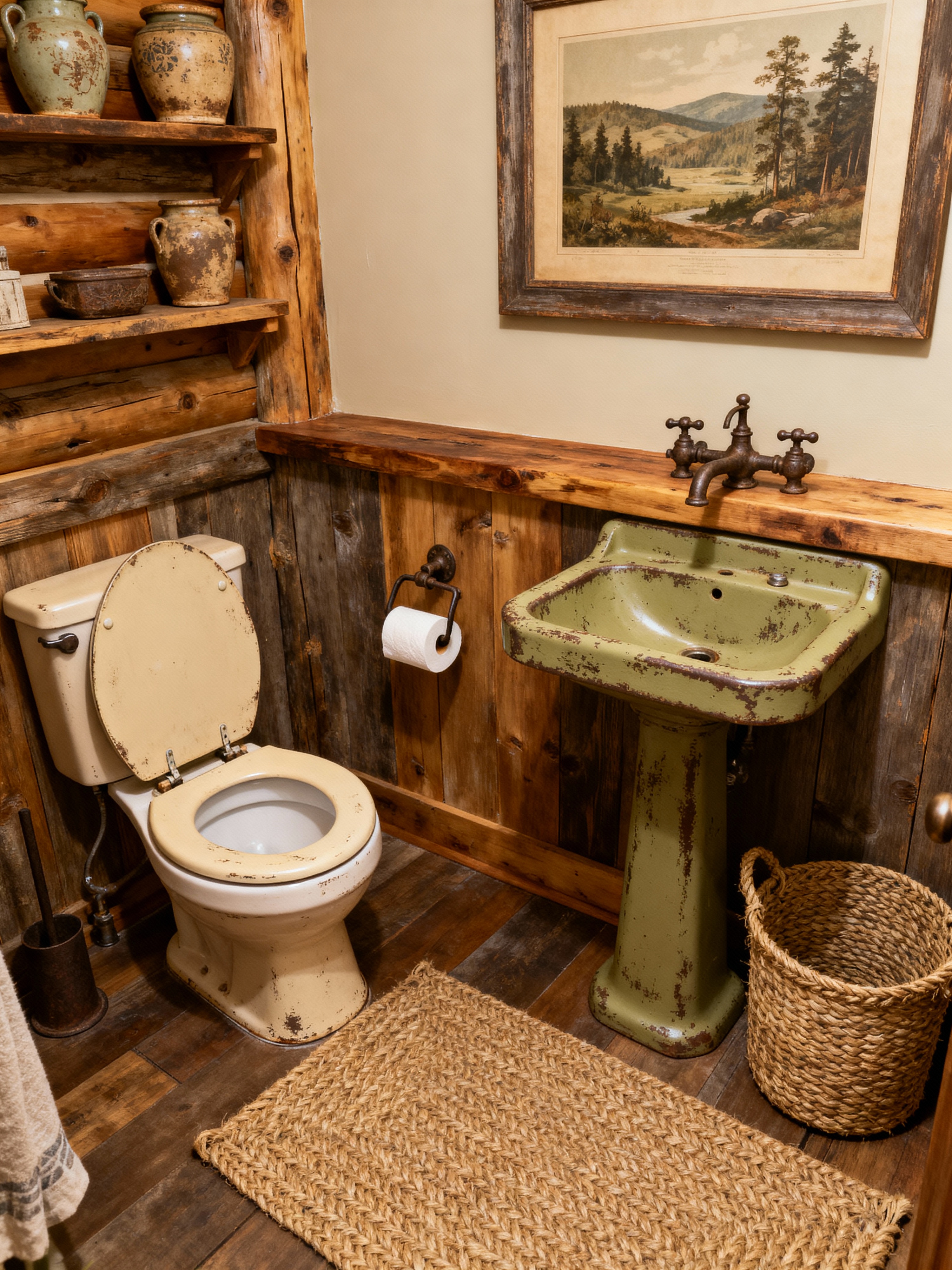 toilet with rustic style with toilet with toilet seat up and sink with tap and toilet paper hanger and toilet with toilet seat up. . with distressed finishes and warmth and woven textures and vintage decor and cozy cabin and earthy tones and iron fixtures and country style