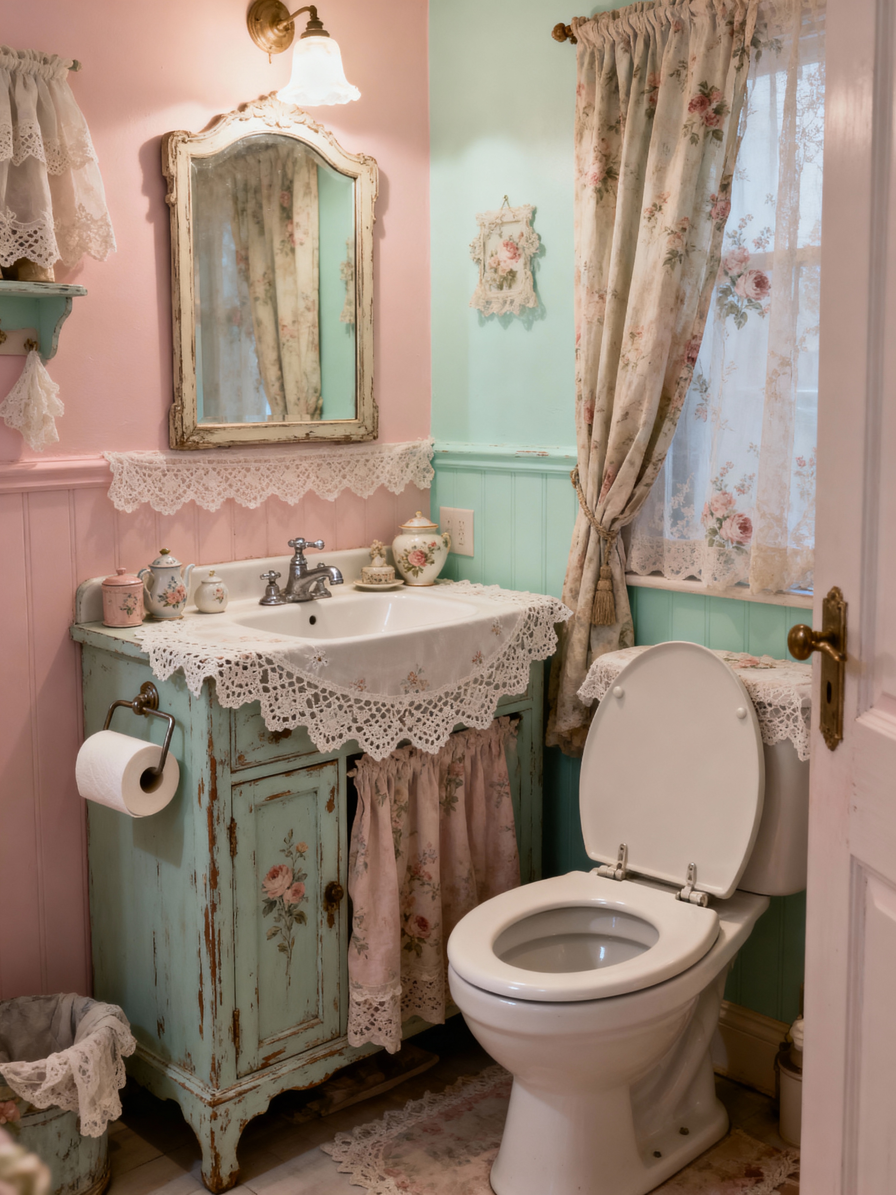 toilet with shabby chic style with toilet paper hanger and toilet with toilet seat up and sink with tap and toilet paper hanger. . with antique lace and romantic style and vintage charm and pastel colors and weathered finishes and feminine touches and delicate details and distressed furniture
