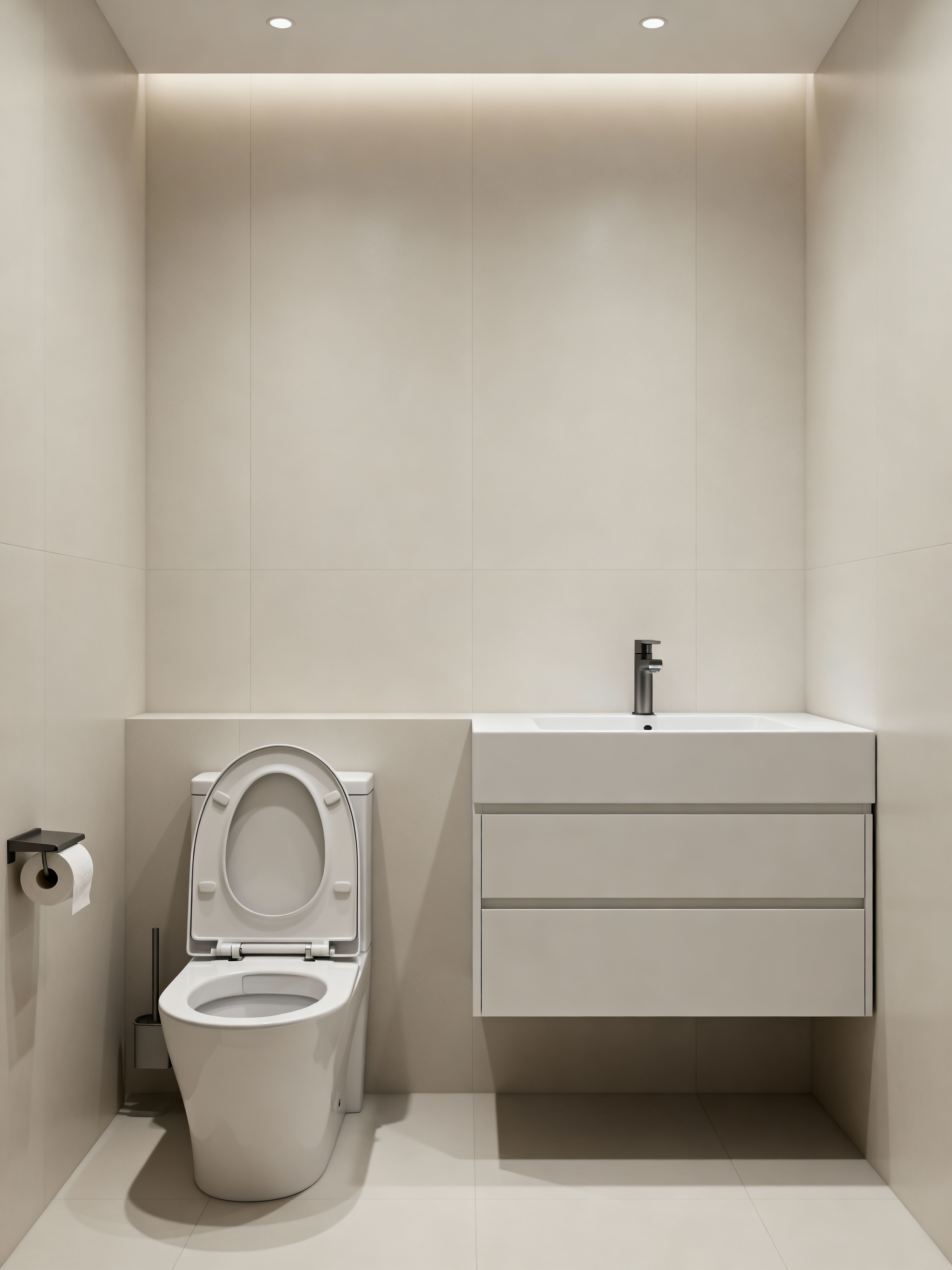 toilet with simple style with sink with tap and toilet with toilet seat up and toilet paper hanger and sink with tap. . with understated style and uncluttered space and basic elements and streamlined look and minimal decor and neutral colors and essential pieces and functional furniture