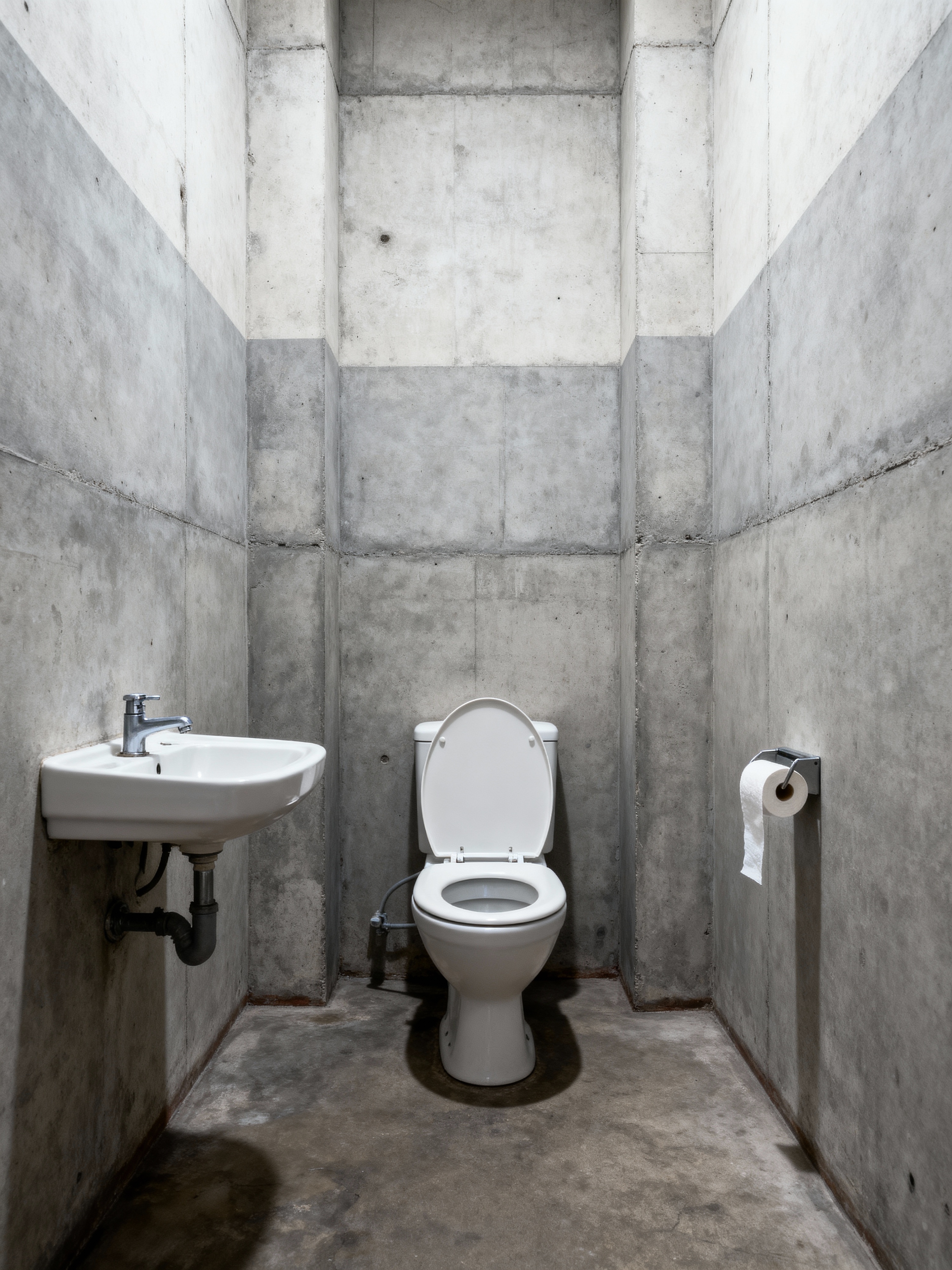 toilet with soviet style with sink with tap and toilet with toilet seat up and toilet paper hanger and sink with tap. . with monumental scale and socialist realism and concrete structures and austere aesthetic and institutional look and brutalist style and functional furniture and communist design
