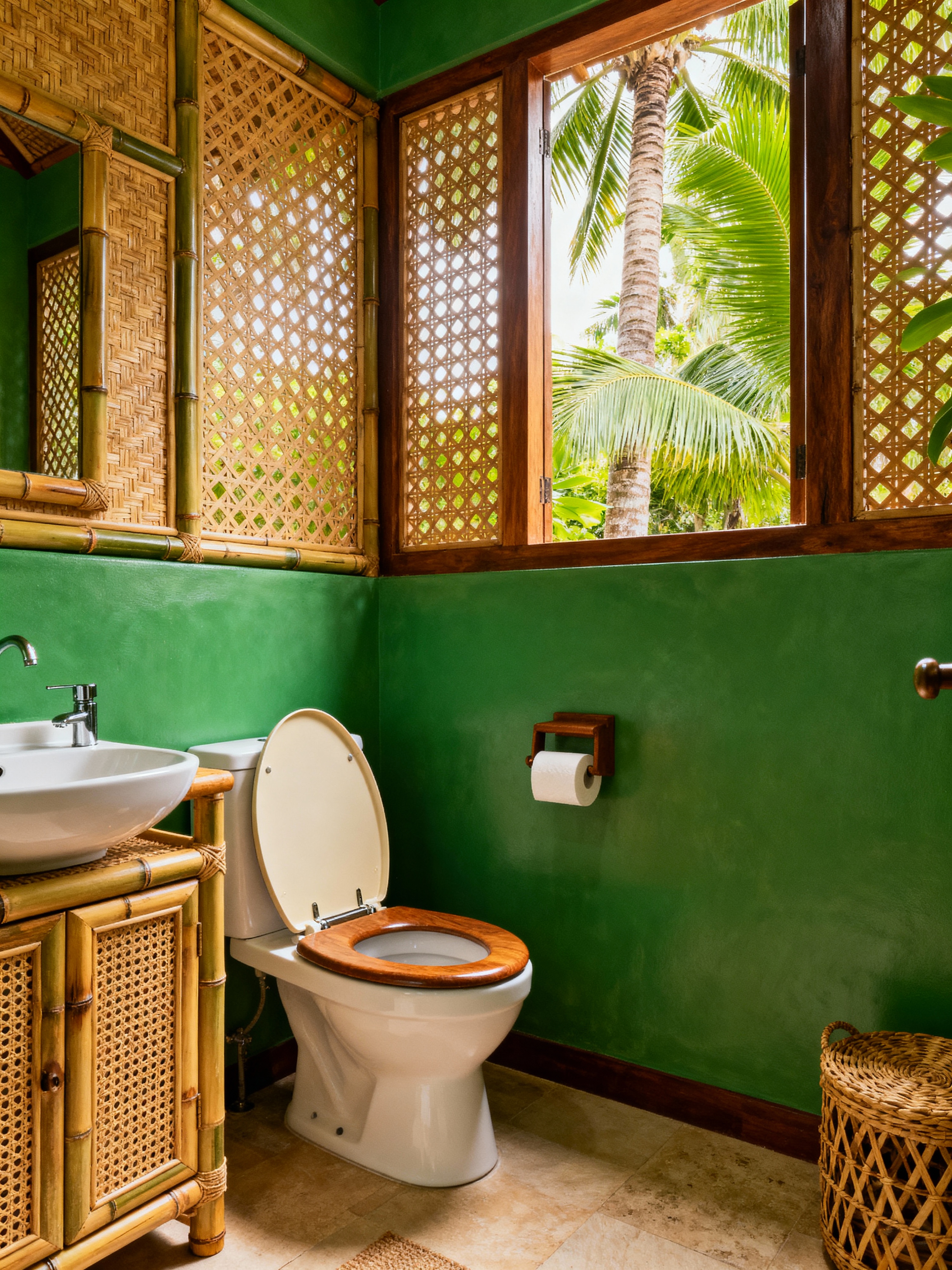 toilet with tropical style with toilet paper hanger and sink with tap and toilet with toilet seat up and toilet paper hanger. . with bamboo and wicker and palm leaves and cane motifs and lattice prints and palm trees and teak and rattan