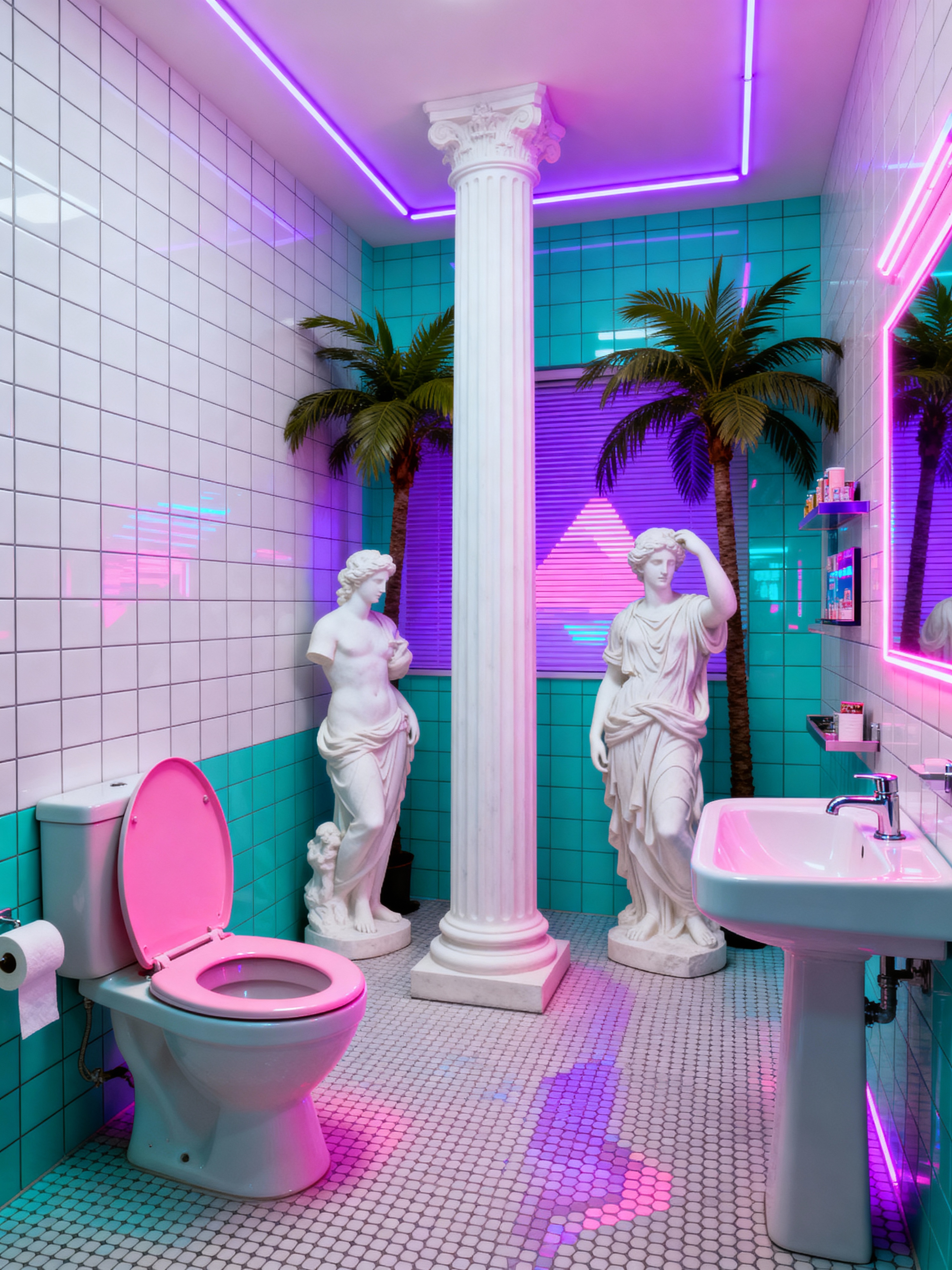 toilet with vaporwave style with toilet paper hanger and sink with tap and toilet with toilet seat up and toilet paper hanger. . with 1980s retail shops and white square bath tiles and purple lights and white roman statues, white roman sculptures, white roman columns, white roman pillars in the center of the room, and bright pink and teal colors and purple lights and palm trees