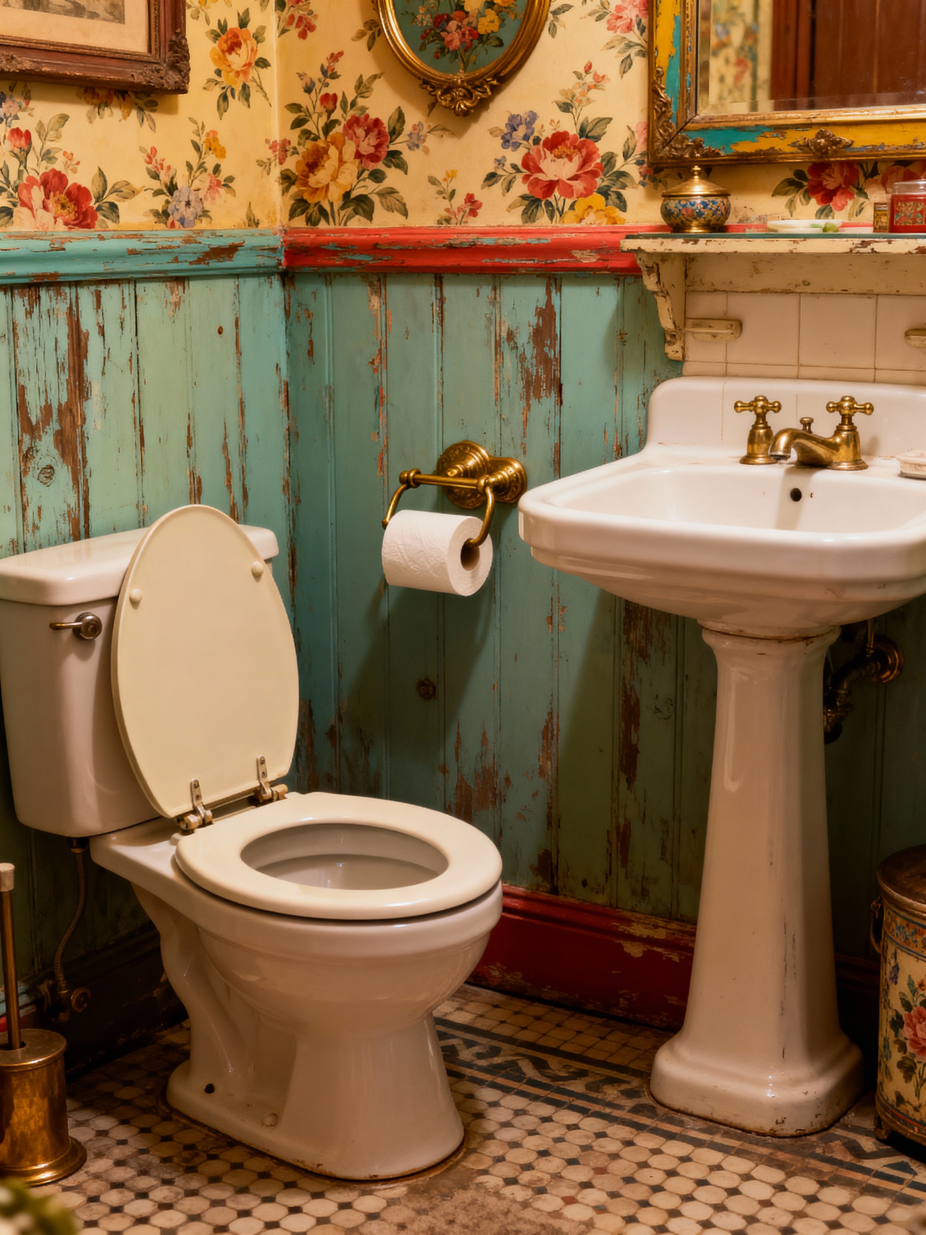 toilet with vintage style with toilet with toilet seat up and sink with tap and toilet paper hanger and toilet with toilet seat up. . with colorful accents and eclectic and mid-century and shabby chic and ornate details and antique decor and retro style and nostalgic feel