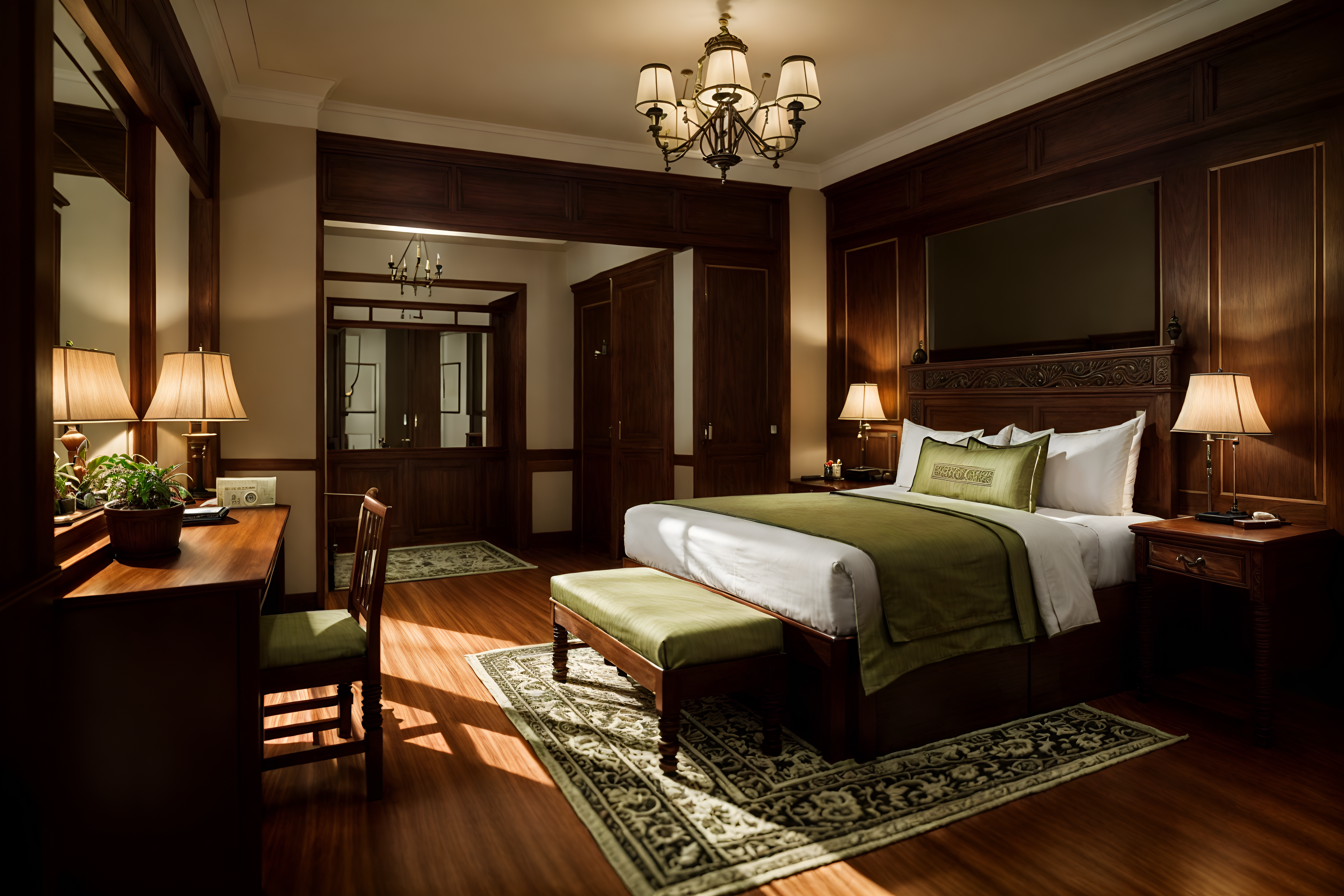 traditional hotel roomsinterior decorate this hotel room with traditional style. . . with mirror and hotel bathroom and headboard and bedside table or night stand and accent chair and working desk with desk chair and night light and plant. . with refined atmosphere and symmetrical layout and crown molding and luxurious textiles and rich fabrics and formal furniture and timeless design and warm colors. . .