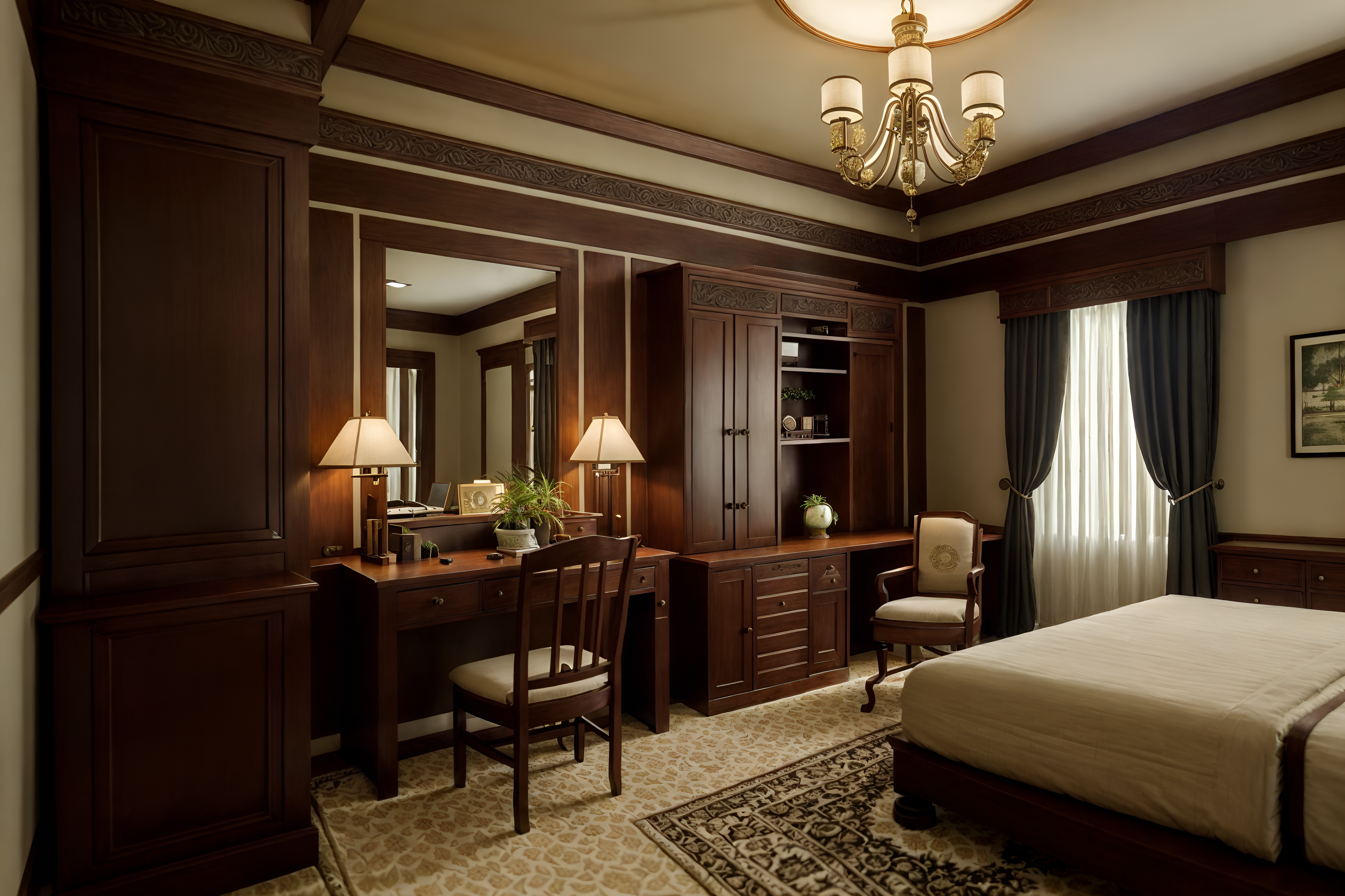 photo from pinterest of traditional-style interior designed (hotel room interior) with plant and storage bench or ottoman and dresser closet and bed and mirror and working desk with desk chair and hotel bathroom and bedside table or night stand cinematic photo, highly detailed, cinematic lighting, ultra-detailed, ultrarealistic, photorealism, 8k. trending on pinterest. traditional interior design style. masterpiece, cinematic light, ultrarealistic+, photorealistic+, 8k, raw photo, realistic, sharp focus on eyes, (symmetrical eyes), (intact eyes), hyperrealistic, highest quality, best quality, , highly detailed, masterpiece, best quality, extremely detailed 8k wallpaper, masterpiece, best quality, ultra-detailed, best shadow, detailed background, detailed face, detailed eyes, high contrast, best illumination, detailed face, dulux, caustic, dynamic angle, detailed glow. dramatic lighting. highly detailed, insanely detailed hair, symmetrical, intricate details, professionally retouched, 8k high definition. strong bokeh. award winning photo.