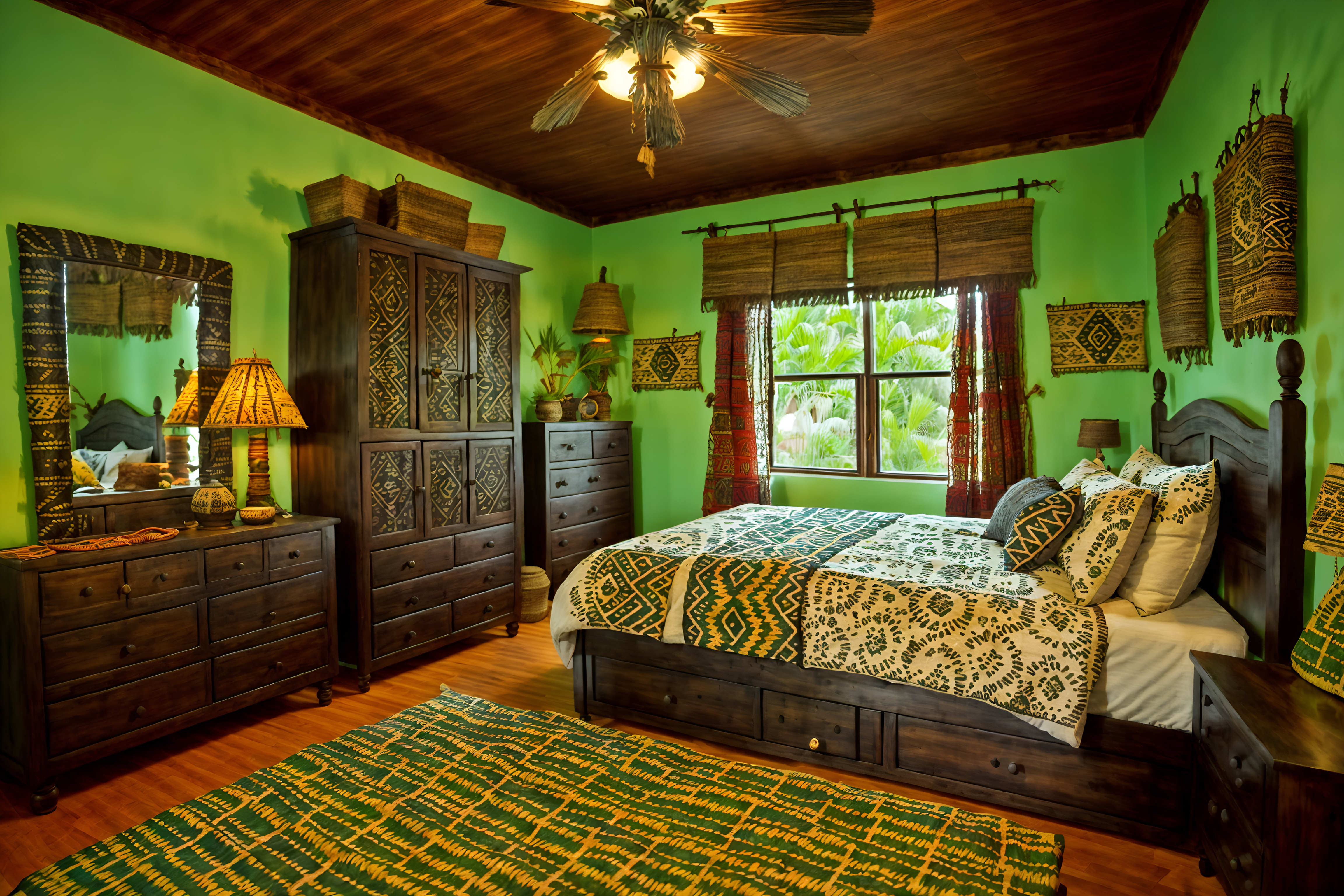 photo from pinterest of tribal-style interior designed (bedroom interior) with dresser closet and plant and night light and accent chair and headboard and bed and mirror and storage bench or ottoman. . with hand dyed batik fabrics and intricate grass weaving and exuberant splashes of colour and tribal patterns and animal prints and tribal revival and animal furslinen and planks of stone. . cinematic photo, highly detailed, cinematic lighting, ultra-detailed, ultrarealistic, photorealism, 8k. trending on pinterest. tribal interior design style. masterpiece, cinematic light, ultrarealistic+, photorealistic+, 8k, raw photo, realistic, sharp focus on eyes, (symmetrical eyes), (intact eyes), hyperrealistic, highest quality, best quality, , highly detailed, masterpiece, best quality, extremely detailed 8k wallpaper, masterpiece, best quality, ultra-detailed, best shadow, detailed background, detailed face, detailed eyes, high contrast, best illumination, detailed face, dulux, caustic, dynamic angle, detailed glow. dramatic lighting. highly detailed, insanely detailed hair, symmetrical, intricate details, professionally retouched, 8k high definition. strong bokeh. award winning photo.
