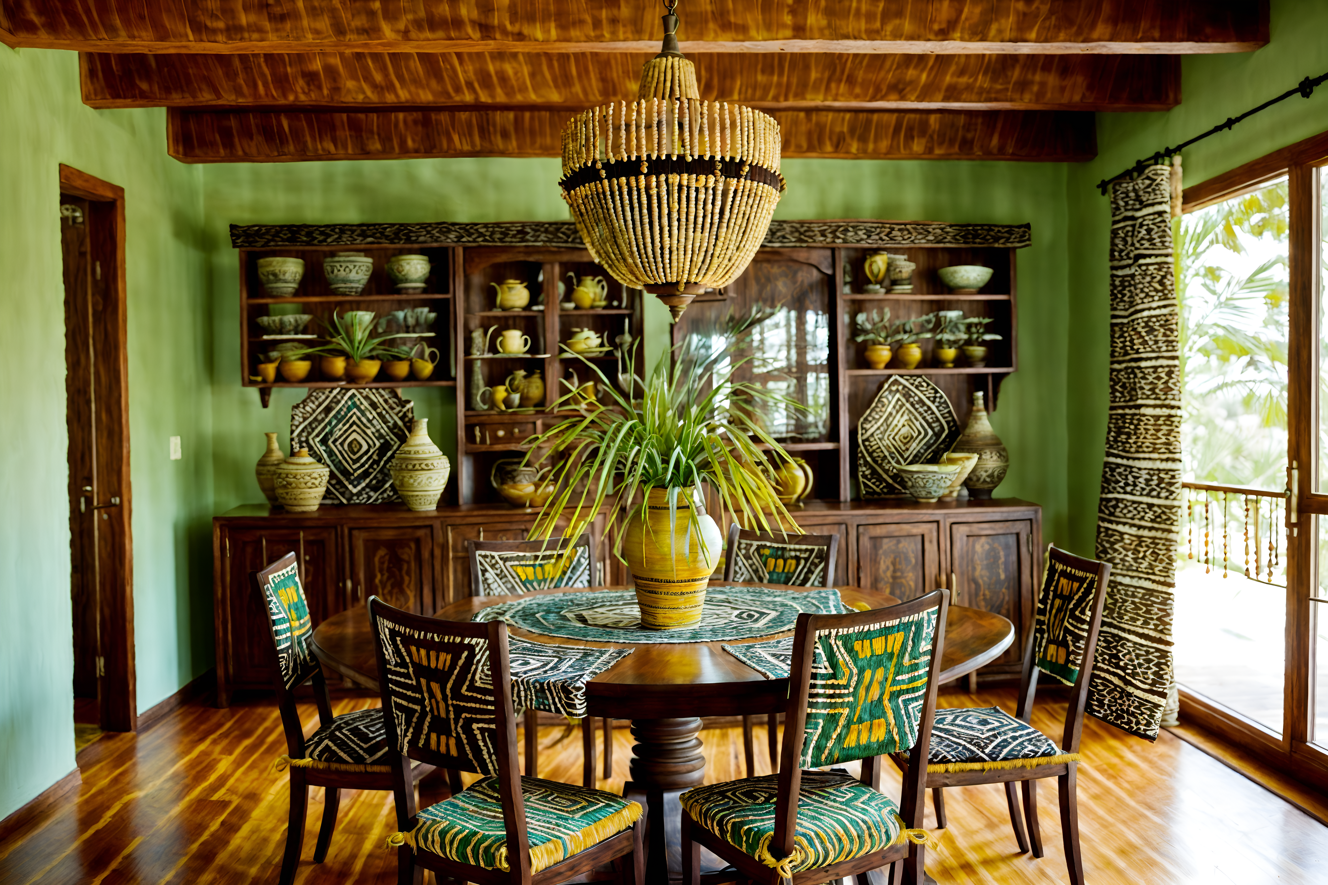 photo from pinterest of tribal-style interior designed (dining room interior) with light or chandelier and bookshelves and dining table and table cloth and dining table chairs and painting or photo on wall and vase and plant. . with hand dyed batik fabrics and intricate grass weaving and animal prints and exuberant splashes of colour and smooth worn timbers and desert colours and tribal patterns and animal furslinen. . cinematic photo, highly detailed, cinematic lighting, ultra-detailed, ultrarealistic, photorealism, 8k. trending on pinterest. tribal interior design style. masterpiece, cinematic light, ultrarealistic+, photorealistic+, 8k, raw photo, realistic, sharp focus on eyes, (symmetrical eyes), (intact eyes), hyperrealistic, highest quality, best quality, , highly detailed, masterpiece, best quality, extremely detailed 8k wallpaper, masterpiece, best quality, ultra-detailed, best shadow, detailed background, detailed face, detailed eyes, high contrast, best illumination, detailed face, dulux, caustic, dynamic angle, detailed glow. dramatic lighting. highly detailed, insanely detailed hair, symmetrical, intricate details, professionally retouched, 8k high definition. strong bokeh. award winning photo.