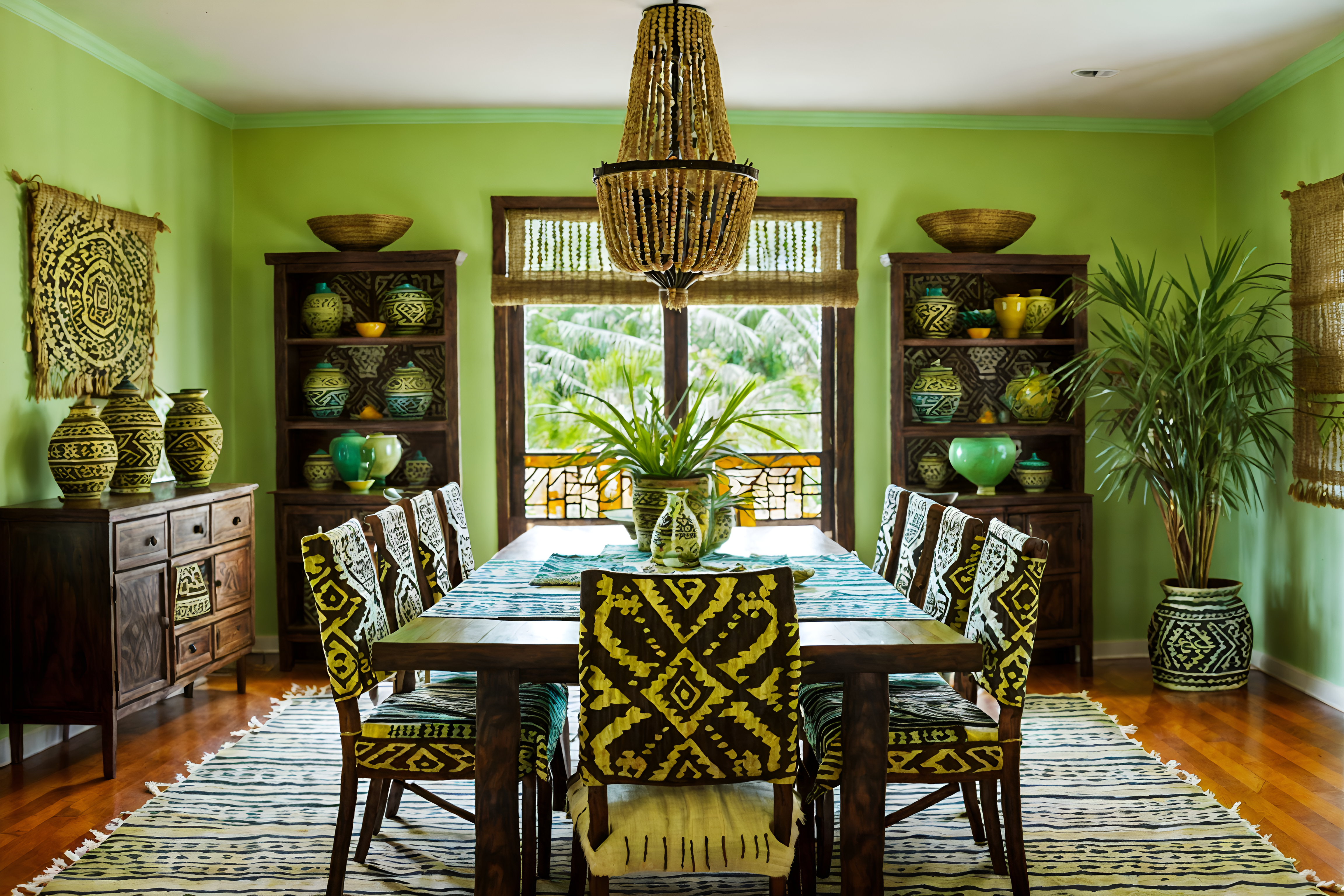 photo from pinterest of tribal-style interior designed (dining room interior) with light or chandelier and bookshelves and dining table and table cloth and dining table chairs and painting or photo on wall and vase and plant. . with hand dyed batik fabrics and intricate grass weaving and animal prints and exuberant splashes of colour and smooth worn timbers and desert colours and tribal patterns and animal furslinen. . cinematic photo, highly detailed, cinematic lighting, ultra-detailed, ultrarealistic, photorealism, 8k. trending on pinterest. tribal interior design style. masterpiece, cinematic light, ultrarealistic+, photorealistic+, 8k, raw photo, realistic, sharp focus on eyes, (symmetrical eyes), (intact eyes), hyperrealistic, highest quality, best quality, , highly detailed, masterpiece, best quality, extremely detailed 8k wallpaper, masterpiece, best quality, ultra-detailed, best shadow, detailed background, detailed face, detailed eyes, high contrast, best illumination, detailed face, dulux, caustic, dynamic angle, detailed glow. dramatic lighting. highly detailed, insanely detailed hair, symmetrical, intricate details, professionally retouched, 8k high definition. strong bokeh. award winning photo.