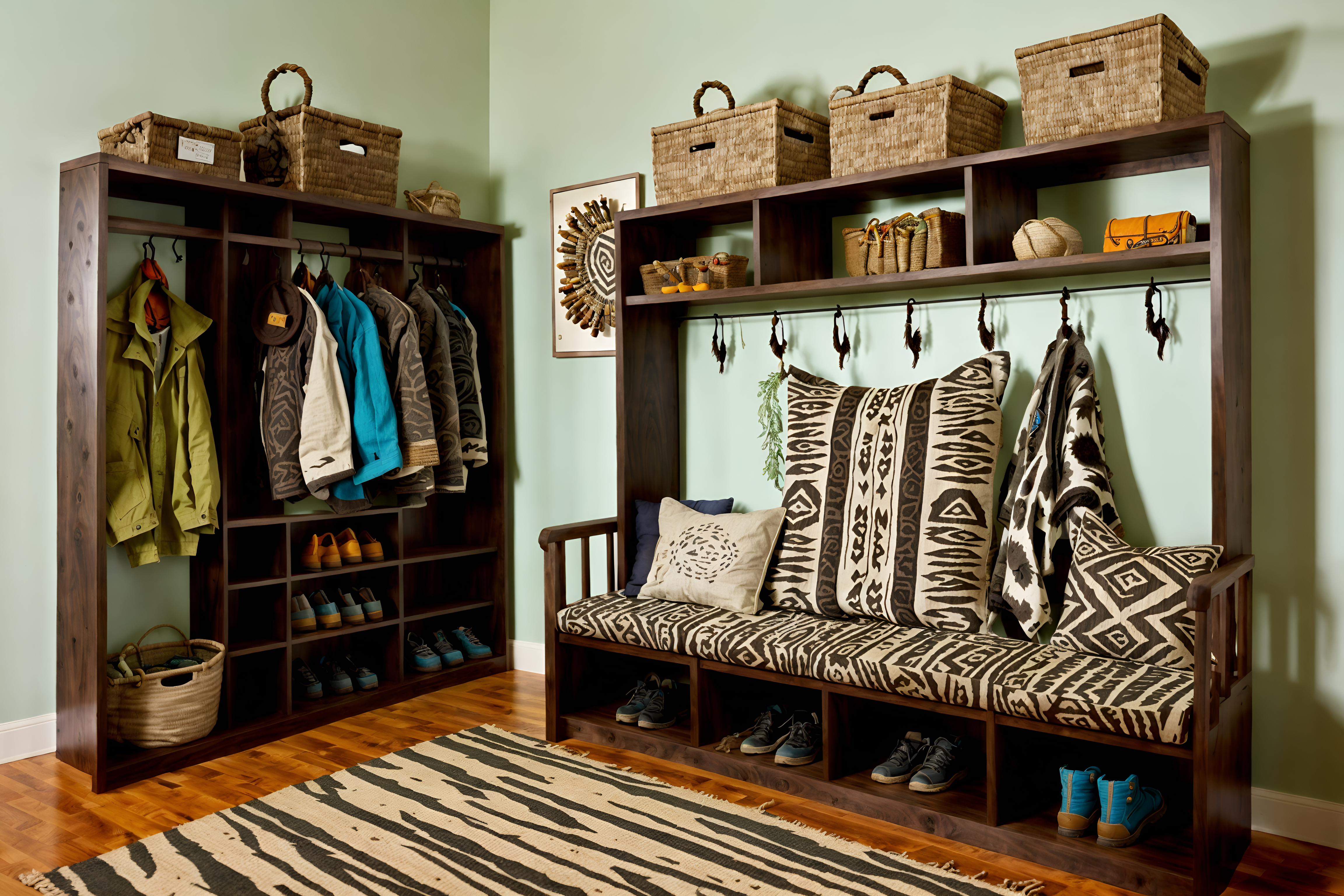 photo from pinterest of tribal-style interior designed (drop zone interior) with storage baskets and shelves for shoes and cubbies and a bench and lockers and cabinets and high up storage and wall hooks for coats. . with smooth worn timbers and animal furslinen and exuberant splashes of colour and planks of stone and animal prints and desert colours and tribal patterns and sculptures and artworks. . cinematic photo, highly detailed, cinematic lighting, ultra-detailed, ultrarealistic, photorealism, 8k. trending on pinterest. tribal interior design style. masterpiece, cinematic light, ultrarealistic+, photorealistic+, 8k, raw photo, realistic, sharp focus on eyes, (symmetrical eyes), (intact eyes), hyperrealistic, highest quality, best quality, , highly detailed, masterpiece, best quality, extremely detailed 8k wallpaper, masterpiece, best quality, ultra-detailed, best shadow, detailed background, detailed face, detailed eyes, high contrast, best illumination, detailed face, dulux, caustic, dynamic angle, detailed glow. dramatic lighting. highly detailed, insanely detailed hair, symmetrical, intricate details, professionally retouched, 8k high definition. strong bokeh. award winning photo.