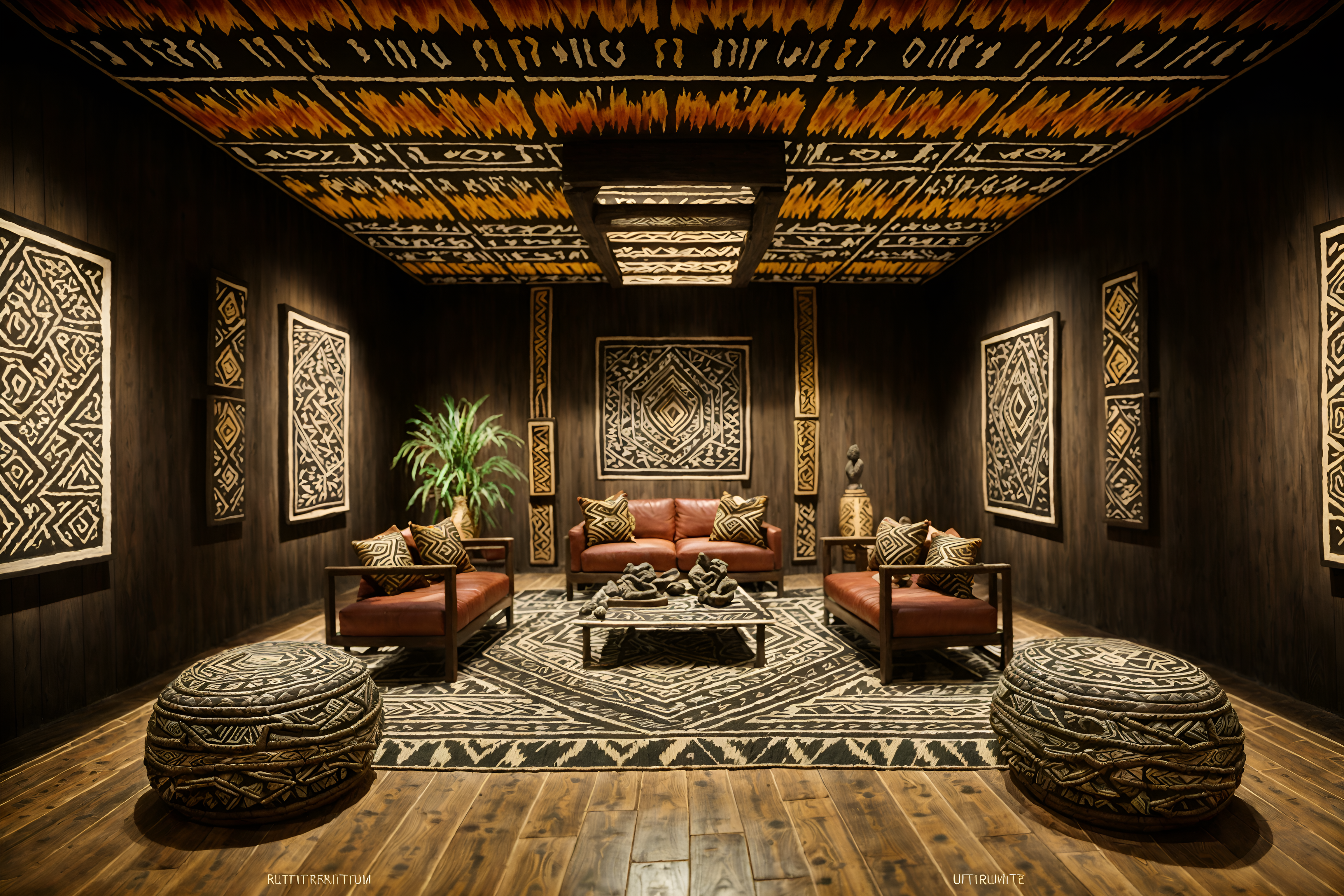 photo from pinterest of tribal-style interior designed (exhibition space interior) . with tribal patterns and sculptures and artworks and tribal revival and desert colours and exuberant splashes of colour and animal prints and planks of stone and intricate grass weaving. . cinematic photo, highly detailed, cinematic lighting, ultra-detailed, ultrarealistic, photorealism, 8k. trending on pinterest. tribal interior design style. masterpiece, cinematic light, ultrarealistic+, photorealistic+, 8k, raw photo, realistic, sharp focus on eyes, (symmetrical eyes), (intact eyes), hyperrealistic, highest quality, best quality, , highly detailed, masterpiece, best quality, extremely detailed 8k wallpaper, masterpiece, best quality, ultra-detailed, best shadow, detailed background, detailed face, detailed eyes, high contrast, best illumination, detailed face, dulux, caustic, dynamic angle, detailed glow. dramatic lighting. highly detailed, insanely detailed hair, symmetrical, intricate details, professionally retouched, 8k high definition. strong bokeh. award winning photo.