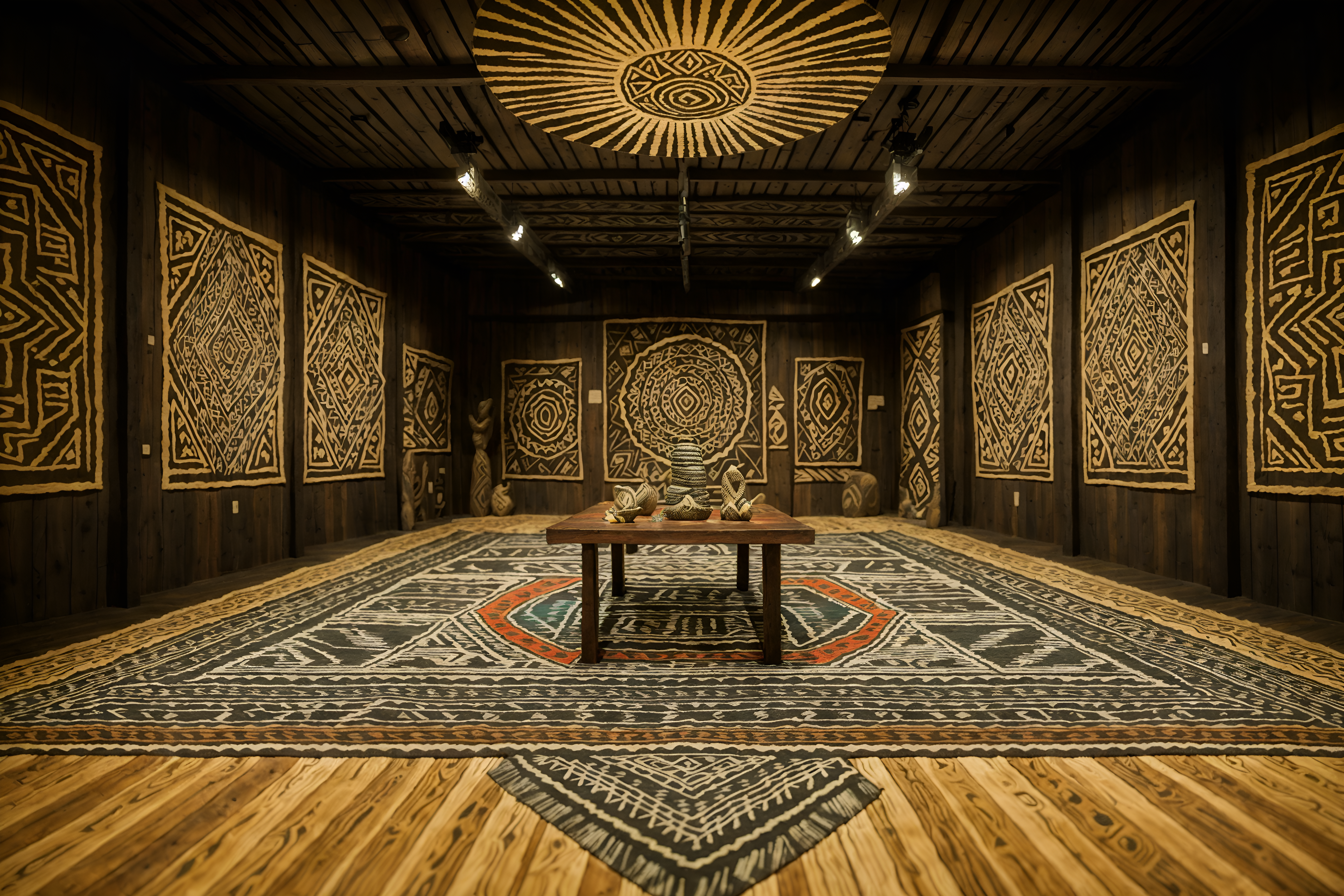 photo from pinterest of tribal-style interior designed (exhibition space interior) . with tribal patterns and sculptures and artworks and tribal revival and desert colours and exuberant splashes of colour and animal prints and planks of stone and intricate grass weaving. . cinematic photo, highly detailed, cinematic lighting, ultra-detailed, ultrarealistic, photorealism, 8k. trending on pinterest. tribal interior design style. masterpiece, cinematic light, ultrarealistic+, photorealistic+, 8k, raw photo, realistic, sharp focus on eyes, (symmetrical eyes), (intact eyes), hyperrealistic, highest quality, best quality, , highly detailed, masterpiece, best quality, extremely detailed 8k wallpaper, masterpiece, best quality, ultra-detailed, best shadow, detailed background, detailed face, detailed eyes, high contrast, best illumination, detailed face, dulux, caustic, dynamic angle, detailed glow. dramatic lighting. highly detailed, insanely detailed hair, symmetrical, intricate details, professionally retouched, 8k high definition. strong bokeh. award winning photo.