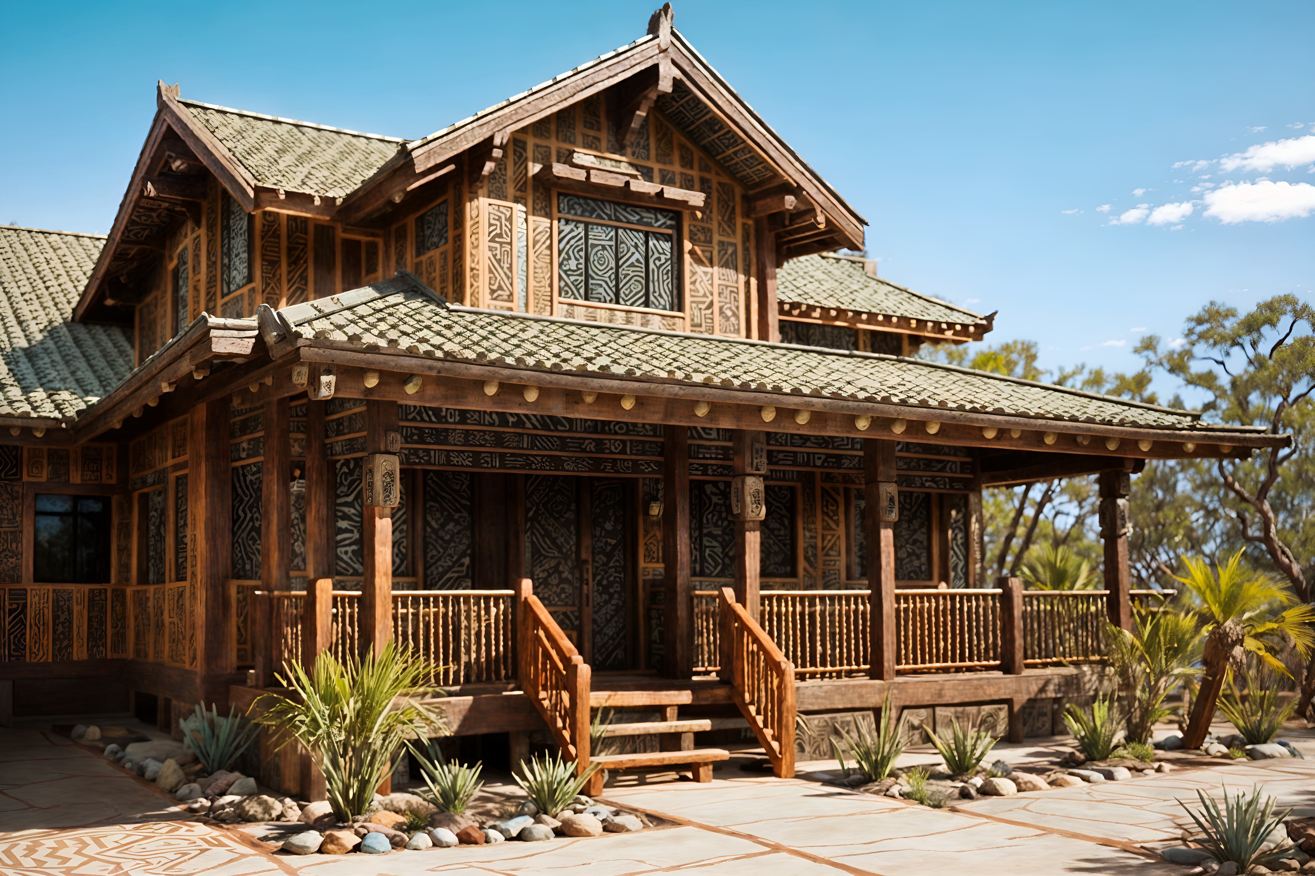 photo from pinterest of tribal-style exterior designed (house exterior exterior) . with exuberant splashes of colour and animal prints and smooth worn timbers and sculptures and artworks and tribal patterns and planks of stone and hand dyed batik fabrics and desert colours. . cinematic photo, highly detailed, cinematic lighting, ultra-detailed, ultrarealistic, photorealism, 8k. trending on pinterest. tribal exterior design style. masterpiece, cinematic light, ultrarealistic+, photorealistic+, 8k, raw photo, realistic, sharp focus on eyes, (symmetrical eyes), (intact eyes), hyperrealistic, highest quality, best quality, , highly detailed, masterpiece, best quality, extremely detailed 8k wallpaper, masterpiece, best quality, ultra-detailed, best shadow, detailed background, detailed face, detailed eyes, high contrast, best illumination, detailed face, dulux, caustic, dynamic angle, detailed glow. dramatic lighting. highly detailed, insanely detailed hair, symmetrical, intricate details, professionally retouched, 8k high definition. strong bokeh. award winning photo.