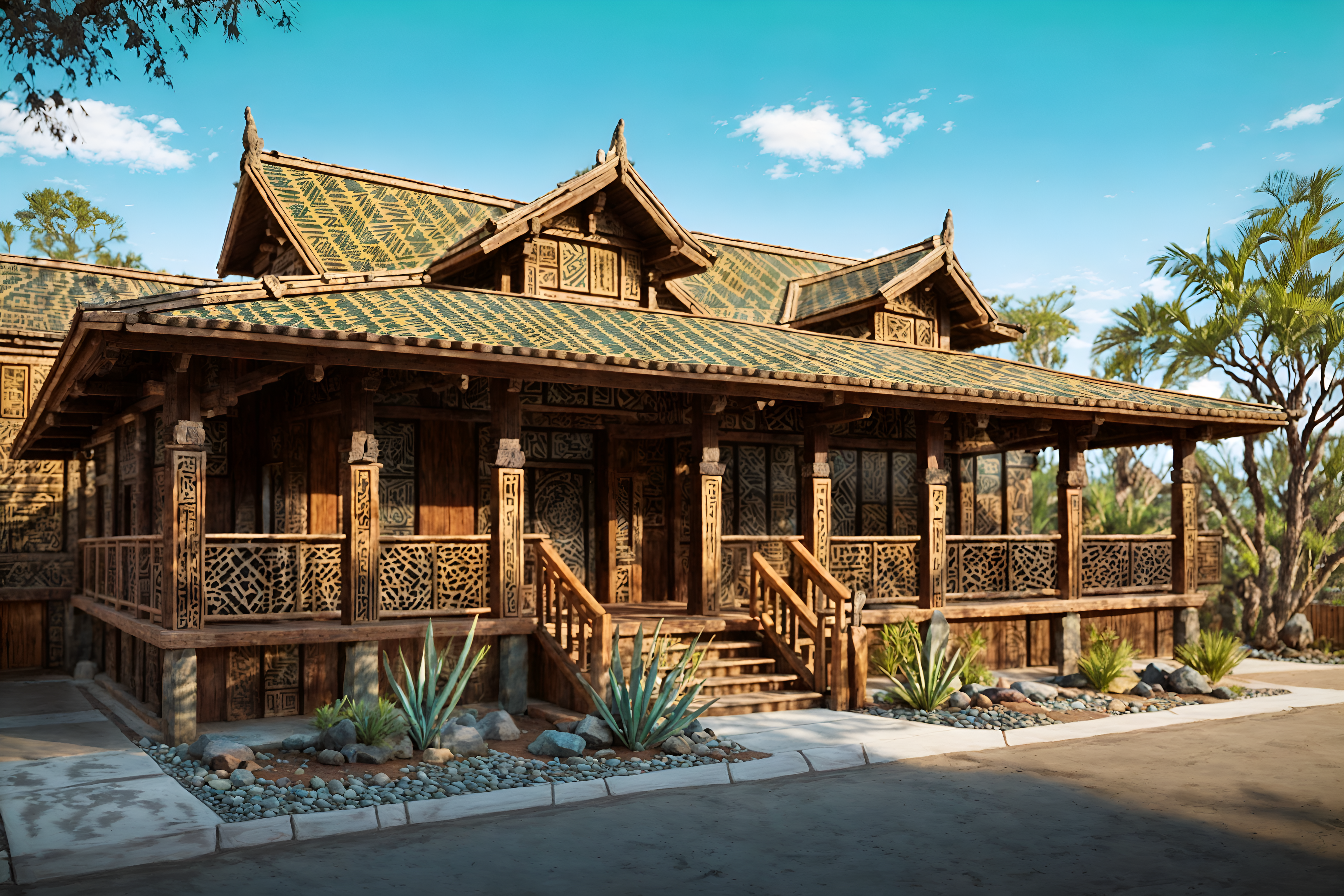 photo from pinterest of tribal-style exterior designed (house exterior exterior) . with exuberant splashes of colour and animal prints and smooth worn timbers and sculptures and artworks and tribal patterns and planks of stone and hand dyed batik fabrics and desert colours. . cinematic photo, highly detailed, cinematic lighting, ultra-detailed, ultrarealistic, photorealism, 8k. trending on pinterest. tribal exterior design style. masterpiece, cinematic light, ultrarealistic+, photorealistic+, 8k, raw photo, realistic, sharp focus on eyes, (symmetrical eyes), (intact eyes), hyperrealistic, highest quality, best quality, , highly detailed, masterpiece, best quality, extremely detailed 8k wallpaper, masterpiece, best quality, ultra-detailed, best shadow, detailed background, detailed face, detailed eyes, high contrast, best illumination, detailed face, dulux, caustic, dynamic angle, detailed glow. dramatic lighting. highly detailed, insanely detailed hair, symmetrical, intricate details, professionally retouched, 8k high definition. strong bokeh. award winning photo.