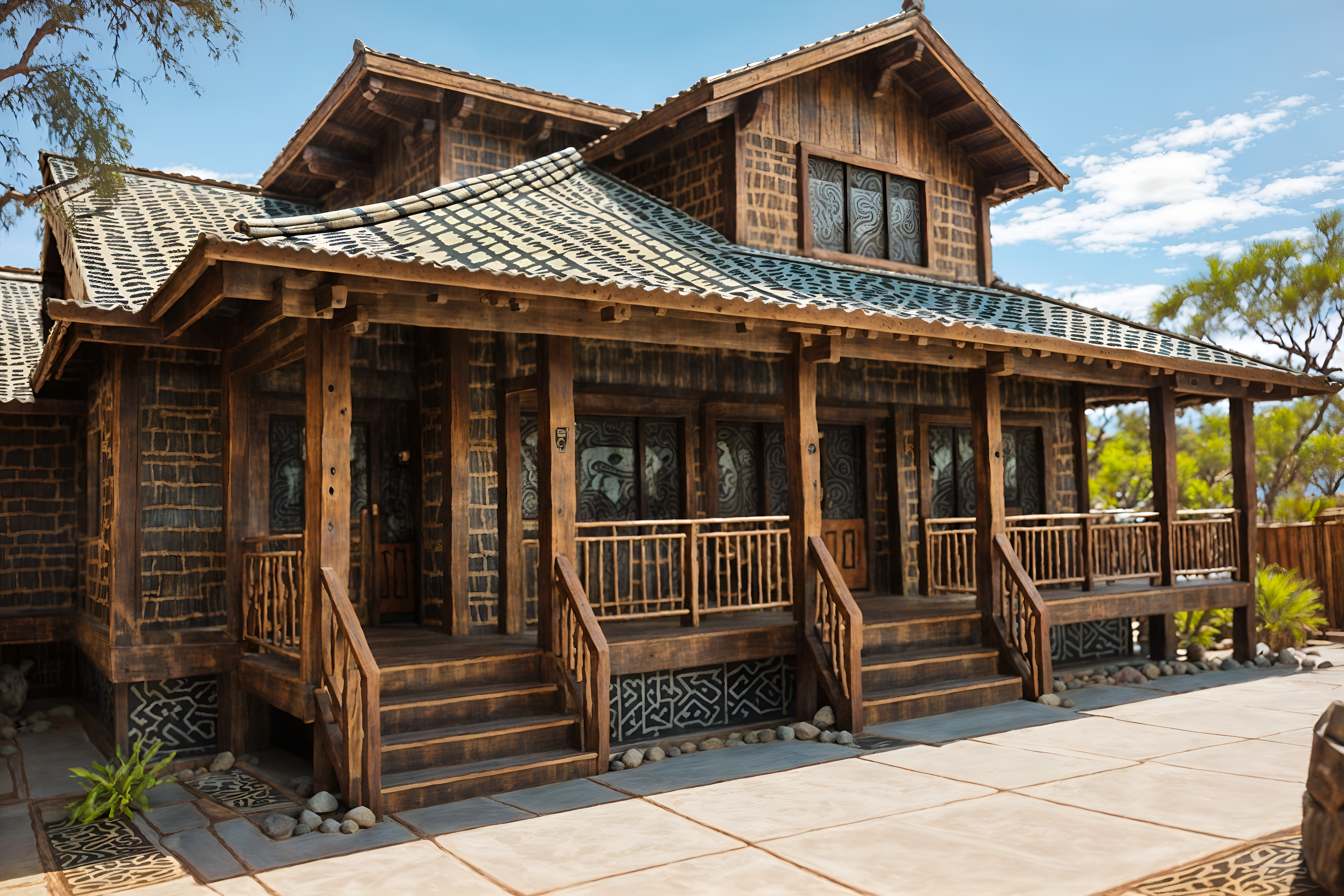 photo from pinterest of tribal-style exterior designed (house exterior exterior) . with exuberant splashes of colour and animal prints and smooth worn timbers and sculptures and artworks and tribal patterns and planks of stone and hand dyed batik fabrics and desert colours. . cinematic photo, highly detailed, cinematic lighting, ultra-detailed, ultrarealistic, photorealism, 8k. trending on pinterest. tribal exterior design style. masterpiece, cinematic light, ultrarealistic+, photorealistic+, 8k, raw photo, realistic, sharp focus on eyes, (symmetrical eyes), (intact eyes), hyperrealistic, highest quality, best quality, , highly detailed, masterpiece, best quality, extremely detailed 8k wallpaper, masterpiece, best quality, ultra-detailed, best shadow, detailed background, detailed face, detailed eyes, high contrast, best illumination, detailed face, dulux, caustic, dynamic angle, detailed glow. dramatic lighting. highly detailed, insanely detailed hair, symmetrical, intricate details, professionally retouched, 8k high definition. strong bokeh. award winning photo.