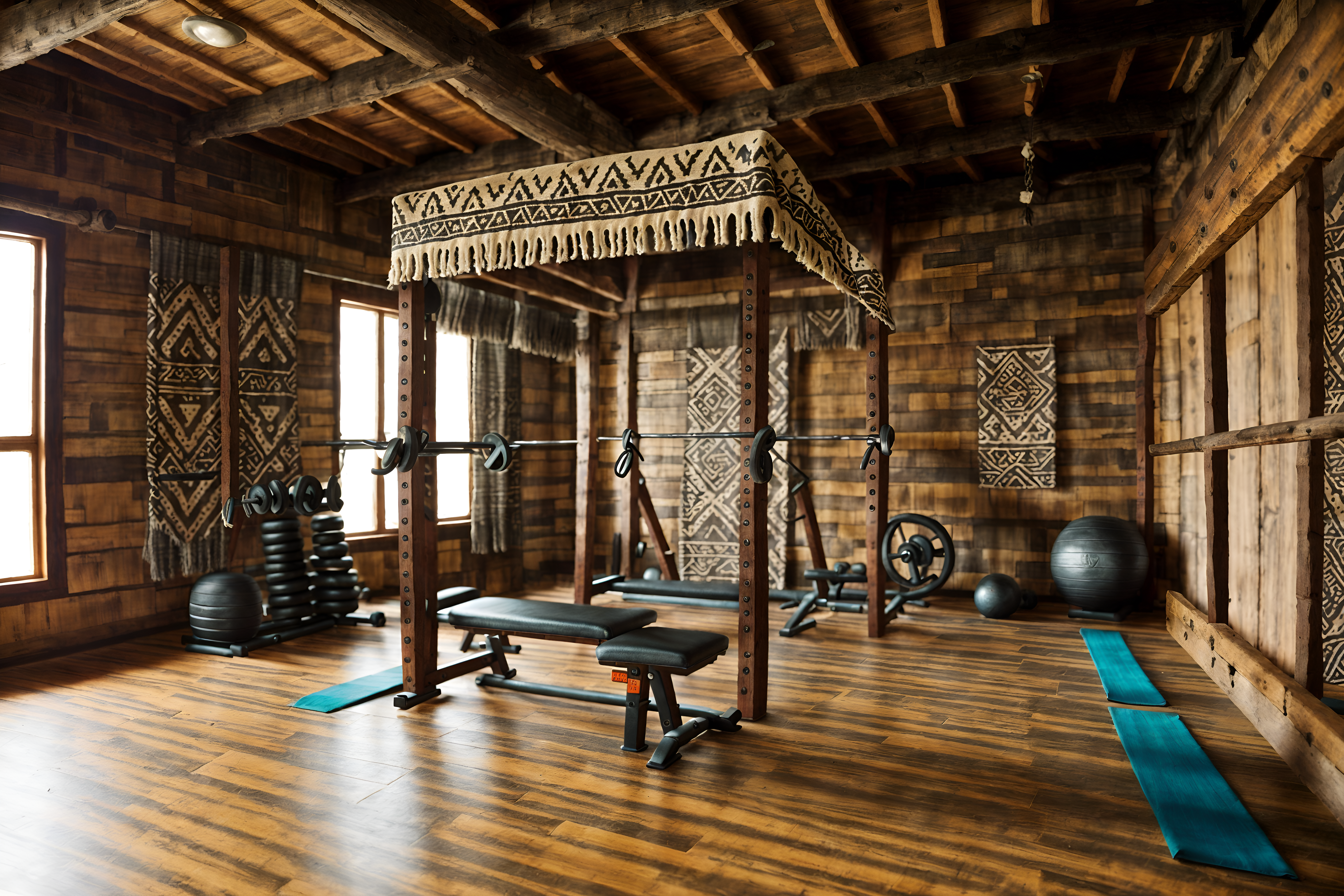 photo from pinterest of tribal-style interior designed (fitness gym interior) with dumbbell stand and exercise bicycle and bench press and crosstrainer and squat rack and dumbbell stand. . with tribal revival and hand dyed batik fabrics and smooth worn timbers and desert colours and exuberant splashes of colour and planks of stone and tribal patterns and animal furslinen. . cinematic photo, highly detailed, cinematic lighting, ultra-detailed, ultrarealistic, photorealism, 8k. trending on pinterest. tribal interior design style. masterpiece, cinematic light, ultrarealistic+, photorealistic+, 8k, raw photo, realistic, sharp focus on eyes, (symmetrical eyes), (intact eyes), hyperrealistic, highest quality, best quality, , highly detailed, masterpiece, best quality, extremely detailed 8k wallpaper, masterpiece, best quality, ultra-detailed, best shadow, detailed background, detailed face, detailed eyes, high contrast, best illumination, detailed face, dulux, caustic, dynamic angle, detailed glow. dramatic lighting. highly detailed, insanely detailed hair, symmetrical, intricate details, professionally retouched, 8k high definition. strong bokeh. award winning photo.