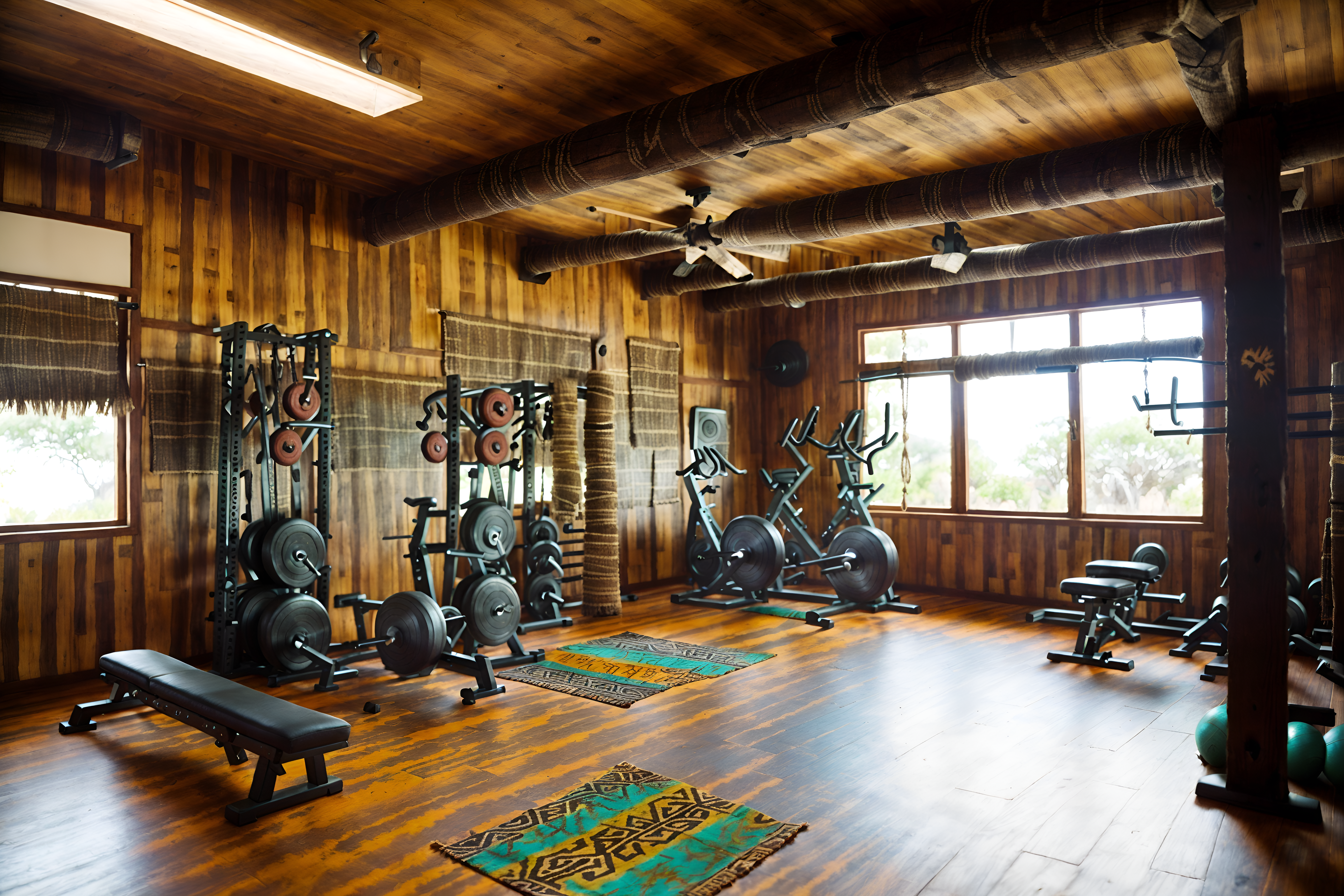photo from pinterest of tribal-style interior designed (fitness gym interior) with dumbbell stand and exercise bicycle and bench press and crosstrainer and squat rack and dumbbell stand. . with tribal revival and hand dyed batik fabrics and smooth worn timbers and desert colours and exuberant splashes of colour and planks of stone and tribal patterns and animal furslinen. . cinematic photo, highly detailed, cinematic lighting, ultra-detailed, ultrarealistic, photorealism, 8k. trending on pinterest. tribal interior design style. masterpiece, cinematic light, ultrarealistic+, photorealistic+, 8k, raw photo, realistic, sharp focus on eyes, (symmetrical eyes), (intact eyes), hyperrealistic, highest quality, best quality, , highly detailed, masterpiece, best quality, extremely detailed 8k wallpaper, masterpiece, best quality, ultra-detailed, best shadow, detailed background, detailed face, detailed eyes, high contrast, best illumination, detailed face, dulux, caustic, dynamic angle, detailed glow. dramatic lighting. highly detailed, insanely detailed hair, symmetrical, intricate details, professionally retouched, 8k high definition. strong bokeh. award winning photo.