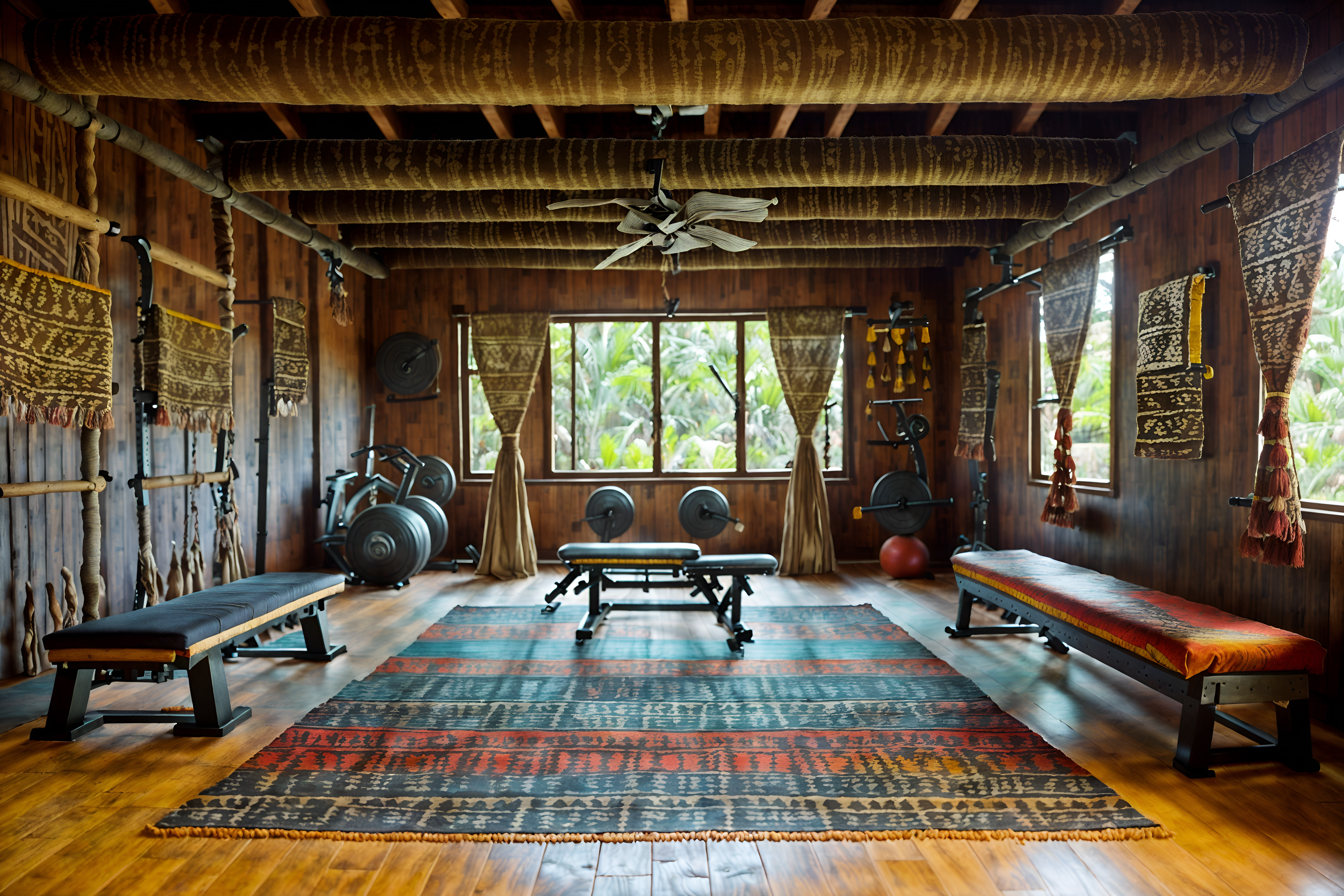 photo from pinterest of tribal-style interior designed (fitness gym interior) with dumbbell stand and exercise bicycle and bench press and crosstrainer and squat rack and dumbbell stand. . with tribal revival and hand dyed batik fabrics and smooth worn timbers and desert colours and exuberant splashes of colour and planks of stone and tribal patterns and animal furslinen. . cinematic photo, highly detailed, cinematic lighting, ultra-detailed, ultrarealistic, photorealism, 8k. trending on pinterest. tribal interior design style. masterpiece, cinematic light, ultrarealistic+, photorealistic+, 8k, raw photo, realistic, sharp focus on eyes, (symmetrical eyes), (intact eyes), hyperrealistic, highest quality, best quality, , highly detailed, masterpiece, best quality, extremely detailed 8k wallpaper, masterpiece, best quality, ultra-detailed, best shadow, detailed background, detailed face, detailed eyes, high contrast, best illumination, detailed face, dulux, caustic, dynamic angle, detailed glow. dramatic lighting. highly detailed, insanely detailed hair, symmetrical, intricate details, professionally retouched, 8k high definition. strong bokeh. award winning photo.