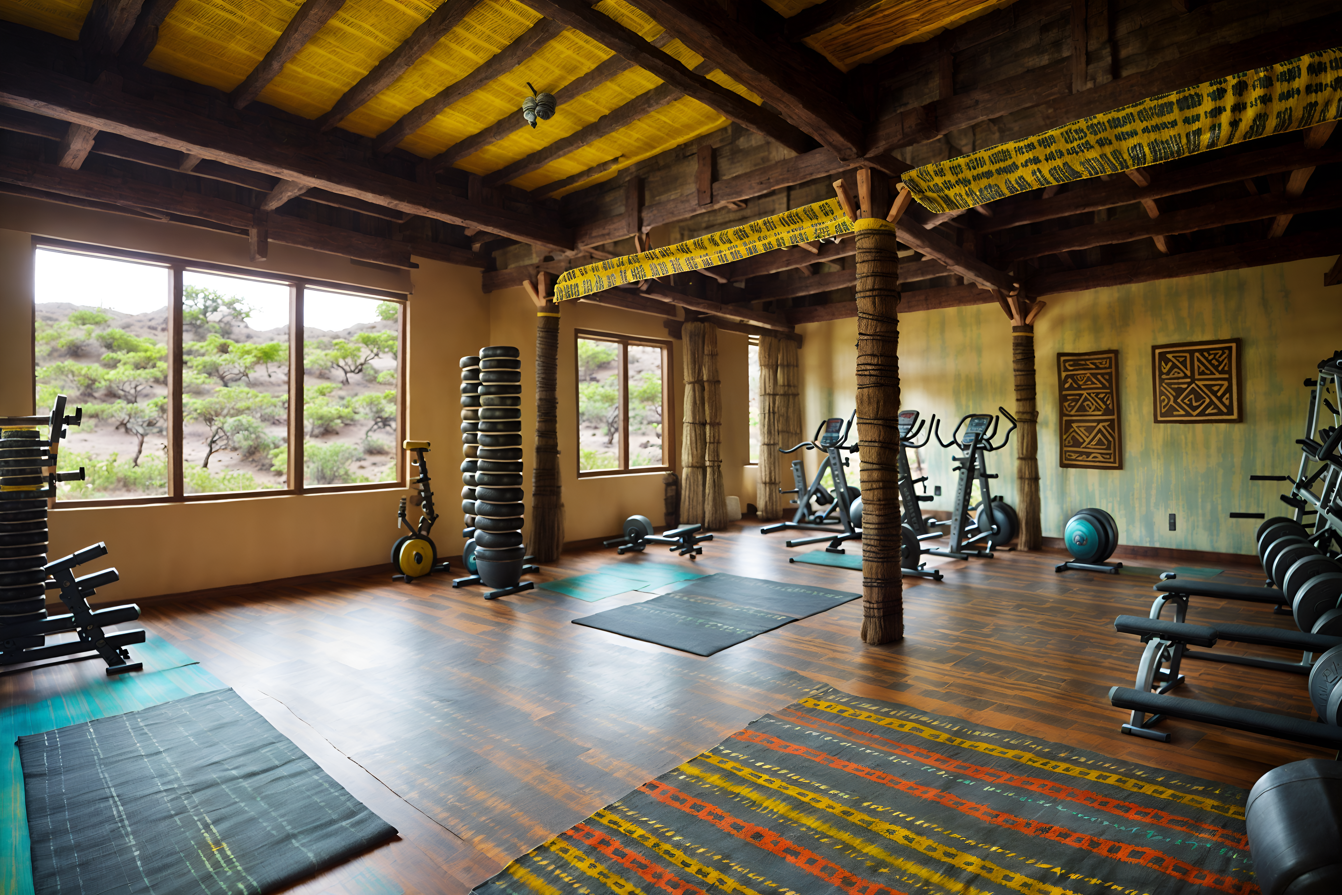 photo from pinterest of tribal-style interior designed (fitness gym interior) with dumbbell stand and exercise bicycle and bench press and crosstrainer and squat rack and dumbbell stand. . with tribal revival and hand dyed batik fabrics and smooth worn timbers and desert colours and exuberant splashes of colour and planks of stone and tribal patterns and animal furslinen. . cinematic photo, highly detailed, cinematic lighting, ultra-detailed, ultrarealistic, photorealism, 8k. trending on pinterest. tribal interior design style. masterpiece, cinematic light, ultrarealistic+, photorealistic+, 8k, raw photo, realistic, sharp focus on eyes, (symmetrical eyes), (intact eyes), hyperrealistic, highest quality, best quality, , highly detailed, masterpiece, best quality, extremely detailed 8k wallpaper, masterpiece, best quality, ultra-detailed, best shadow, detailed background, detailed face, detailed eyes, high contrast, best illumination, detailed face, dulux, caustic, dynamic angle, detailed glow. dramatic lighting. highly detailed, insanely detailed hair, symmetrical, intricate details, professionally retouched, 8k high definition. strong bokeh. award winning photo.